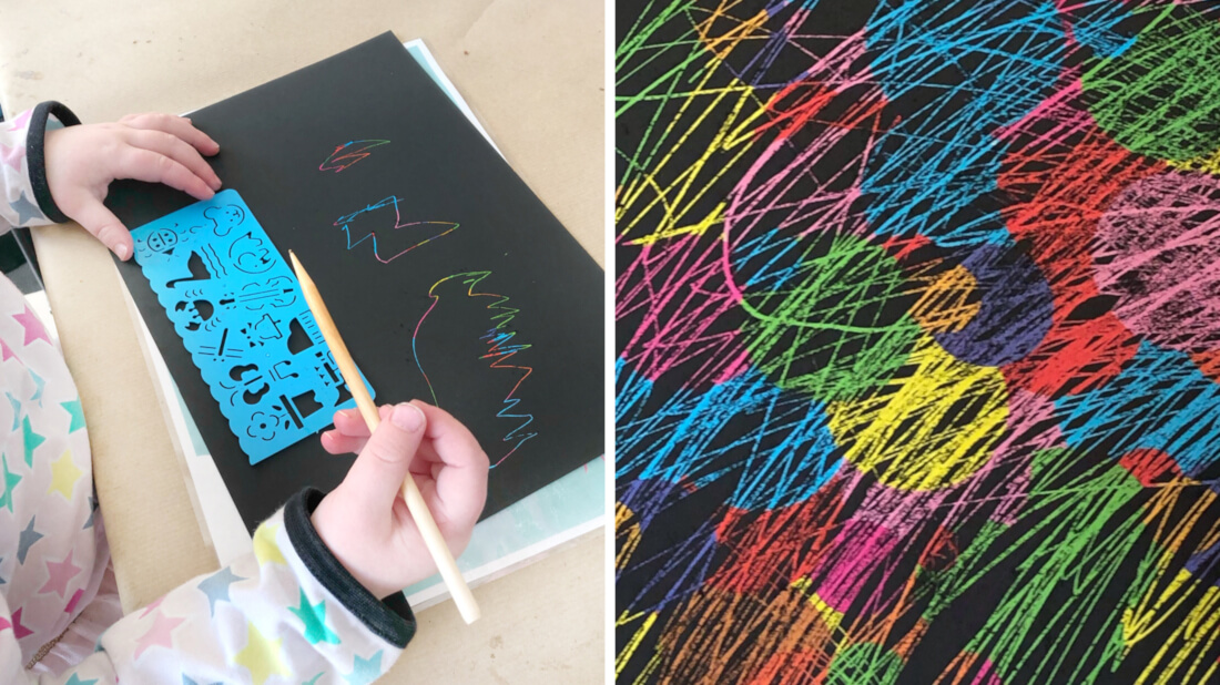Jedes Kind bekommt einen Kratzbild-Bogen und einen Holzstift. Alle malen ein Bild als Eintrittskarte fürs Regenbogenland. Nach dem Malen der Regenbogenbilder am besten Hände waschen (die schwarze Farbe der Kratzbilder färbt ab), bevor es mit der nächsten Aufgabe weiter geht.