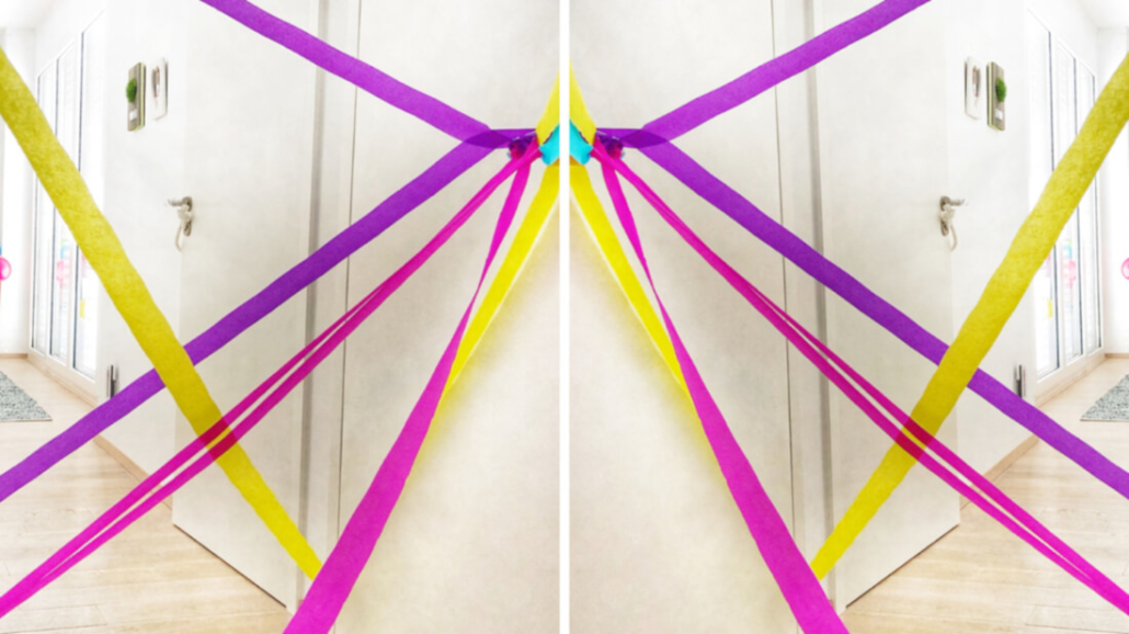 - Kreppbänder an einer Stelle im Raum oder am besten in einem engen Flur kreuz und quer spannen = Regenbogenwald. Ich habe Kreppbänder an Türen, Türklinken und am Boden befestigt (-> doppelseitiges Klebeband). Hinweis: Der Regenbogenwald kommt im Ablauf nach der Zaubertüre aus Luftballons