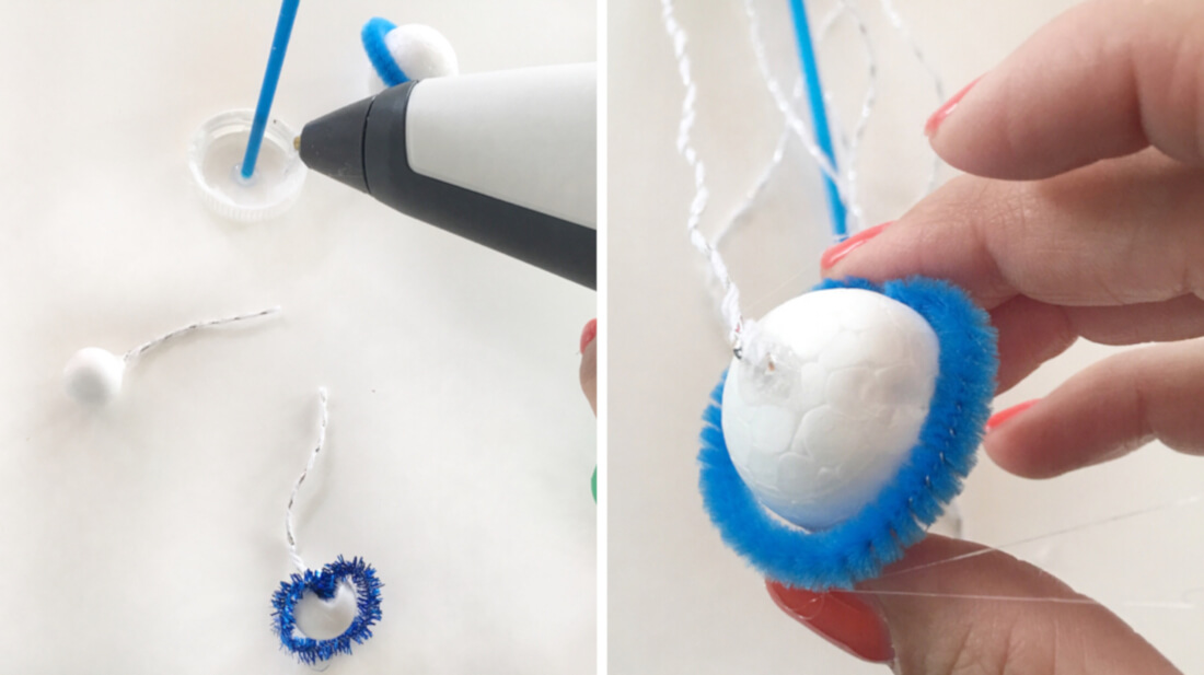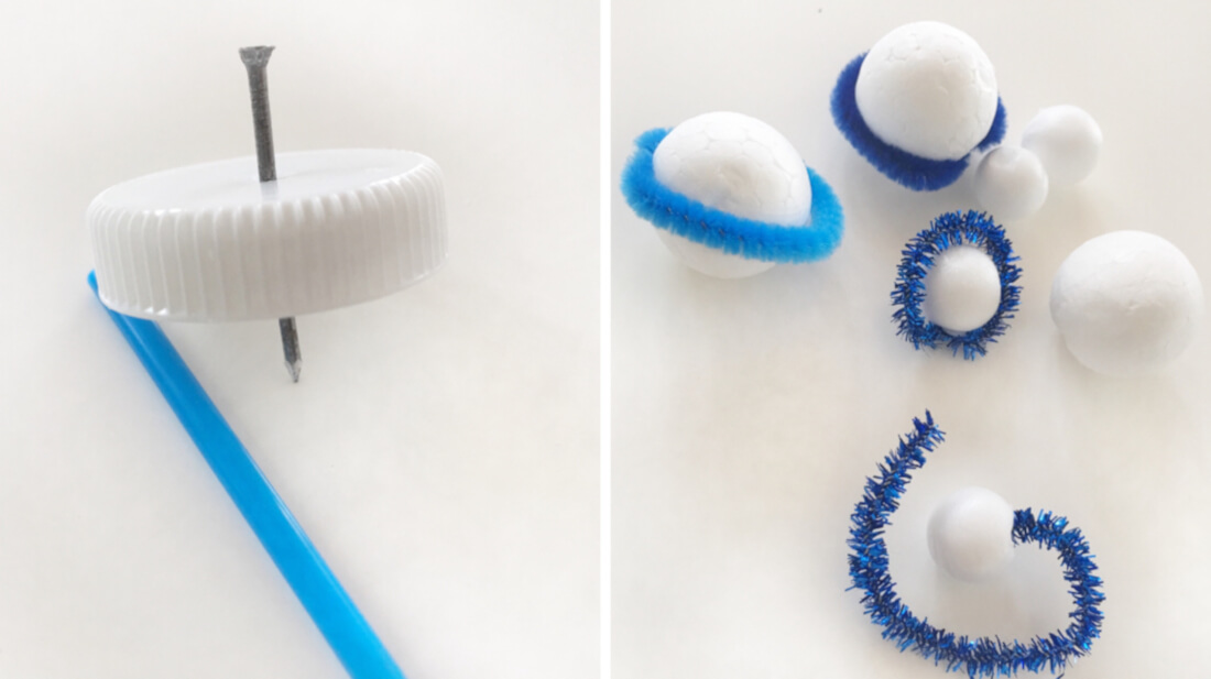 Zur Stabilisierung des Cakepopper-Stiels bohrt ihr einen Nagel durch den Deckel. 3 der 4 Styroporkugeln bekommen einen Ring aus Pfeifenputzern. Dazu die Länge des Pfeifenputzers an der Styroporkugel abmessen und die Enden des Pfeifenputzers jeweils in das Loch der Styroporkugel stecken. Oben auf den Deckel klebt ihr erst die silberne Scheibe und dann eine der großen Styroporkugeln fest. Den Stiel klebt ihr an der unteren Hälfte des Nagels fest.