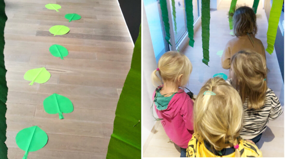 Vorbereitung: Du schneidest aus den Tonpapierbögen ca. 10 große Blätter aus. Das geht ganz easy indem du die DINA4-Bögen längst faltest und dann die halbe Blattform ausschneidest (der bauchige Teil ist an der offenen Kante). Die 10 Blätter klebst du hintereinander dort am Boden fest, wo die Dschungel-Schatzsuche starten soll. Zusätzlich kannst du unsere Dschungel-Wegweiser ausdrucken. Damit kannst du den kompletten Weg bis zum Schatz markieren. Je nach Alter der Kinder kann dieser Weg kürzer oder länger sein.