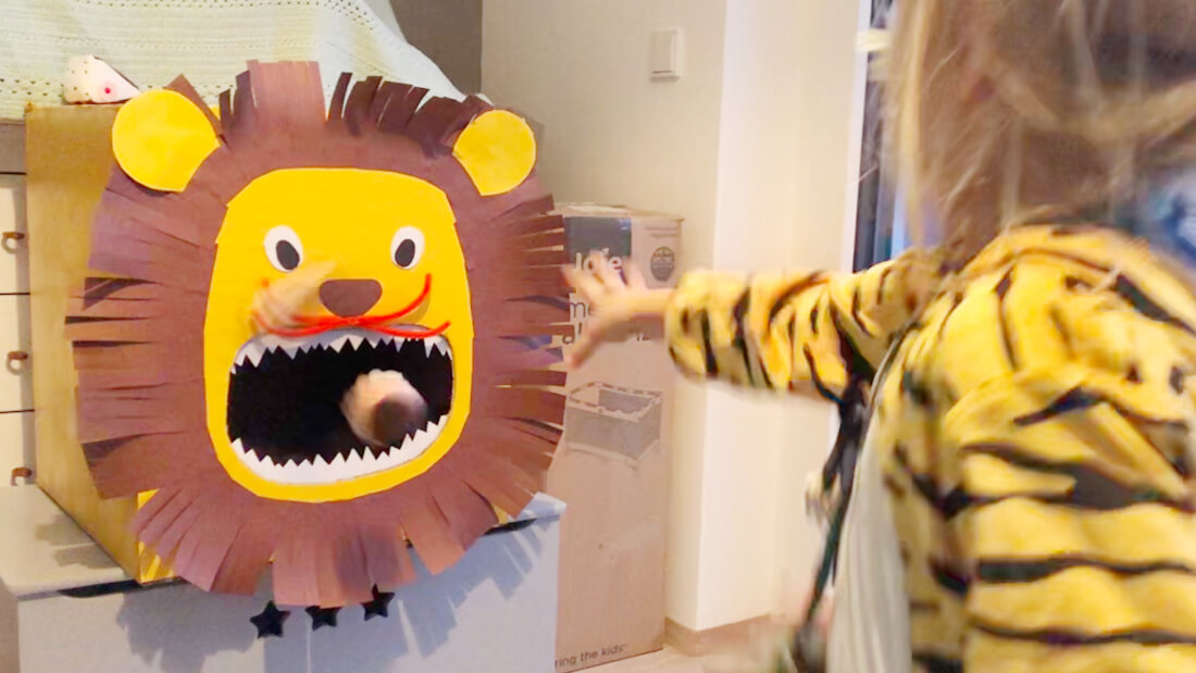 Vorbereitung: Du bastelst aus dem Versandkarton einen Löwen. Am wichtigsten ist dabei der große, runde Ausschnitt für das Löwenmaul. Dort werfen die Kinder bei der Schatzsuche das Löwenfutter rein. Alles andere am Löwen ist Deko. Da kannst du deiner Kreativität freien Lauf lassen.