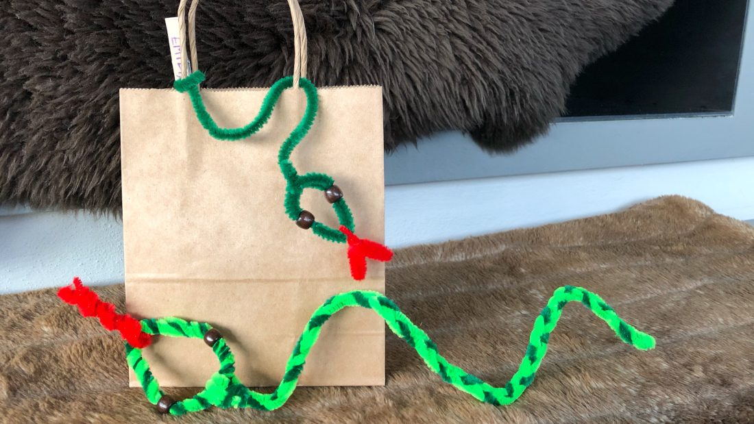 Du brauchst: 2 Klorollen pro Kind, braune Acrylfarbe, Papier mit Tierprint, Glitzerklebeband, Tesafilm und Bastschnur.