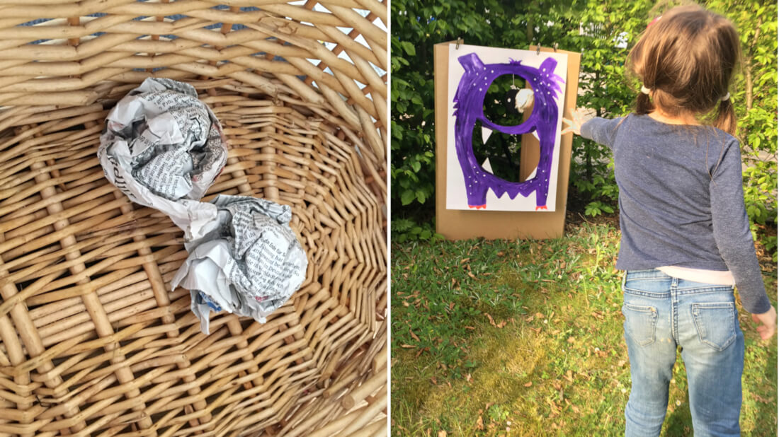Und dann geht es auch schon los mit dem Wurfspiel. Mhh… fehlt da nicht noch was? Ach ja – wir brauchen noch Bälle. Die machen wir uns schnell selbst aus Zeitungspapier. Denn die sind leicht und reißen uns nicht die schönen Monster kaputt. Außerdem eignen die sich auch für eine Indoorparty bei schlechtem Wetter. Für eine bessere Stabilität kannst du die Zeitungspapier-Bälle mit Kreppklebeband umwickeln… dann fliegen sie noch besser.