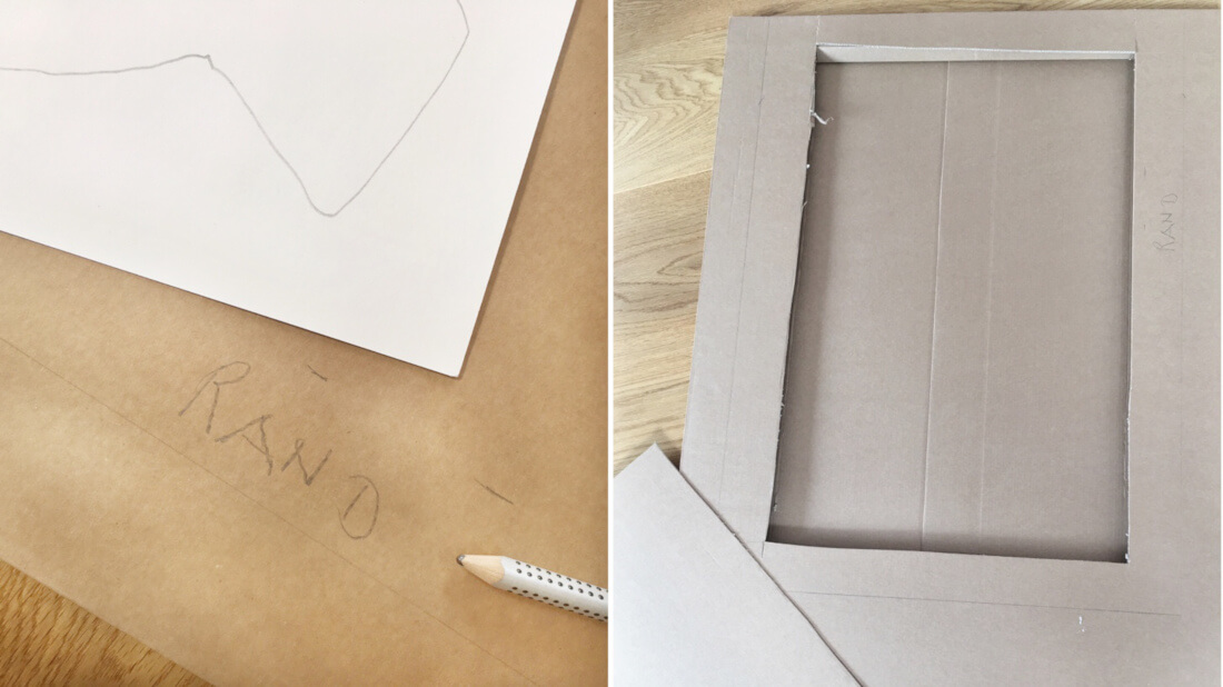 Da der Tonkarton den Ausschnitt später verdecken soll, muss der Ausschnitt etwas kleiner sein. Am besten zeichnest du in dem Rahmen mit ca. 3 cm Abstand einen kleineren Rahmen. Das kleinere Fenster entfernst du nun mit einem Cuttermesser.