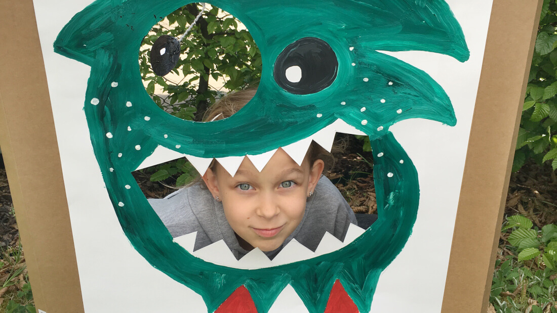 Nach dem Wurfspiel könnt ihr mit der Monsterwand total lustige Fotos machen. Die sind eine richtig coole Erinnerung an den Monstergeburtstag und können nach der Party als Dankeschön an alle Gäste verteilt werden.