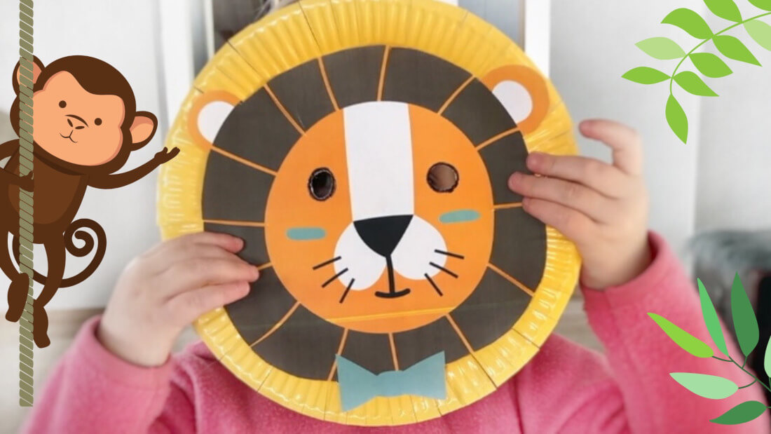 Wenn ihr den Löwenkopf auch als Tiermaske benutzen wollt, schneidet ihr mit einer spitzen Schere die Augen raus. Danach bohrt ihr unter der Papiermähne der Druckvorlage verdeckt auf jeder Seite ein kleines Loch in den Pappteller. Durch die kleinen Löcher zieht ihr die Enden des Hutgummis jeweils durch und macht mehrere Knoten (bis der Knoten nicht mehr durch das kleine Loch rutscht). Zur Sicherheit könnt ihr den Knoten noch mit einem Tesafilmstreifen überkleben.