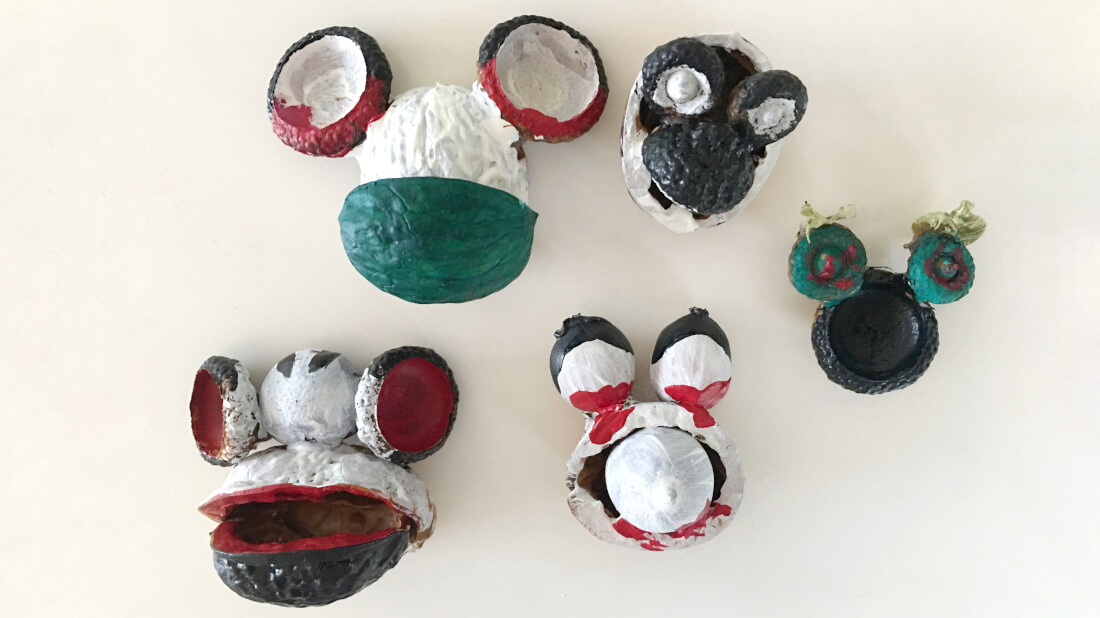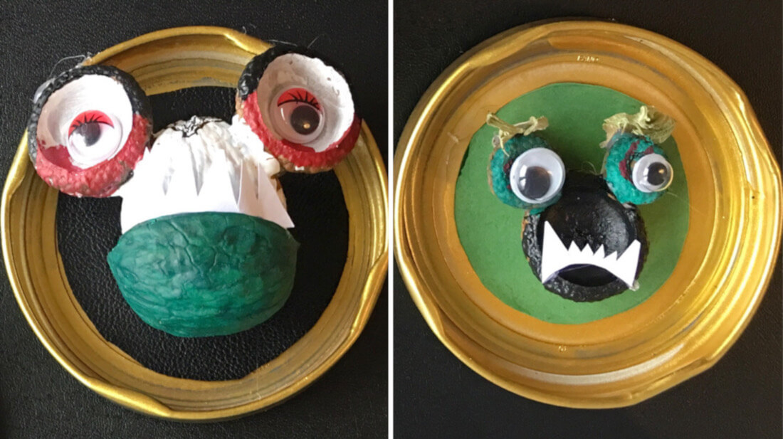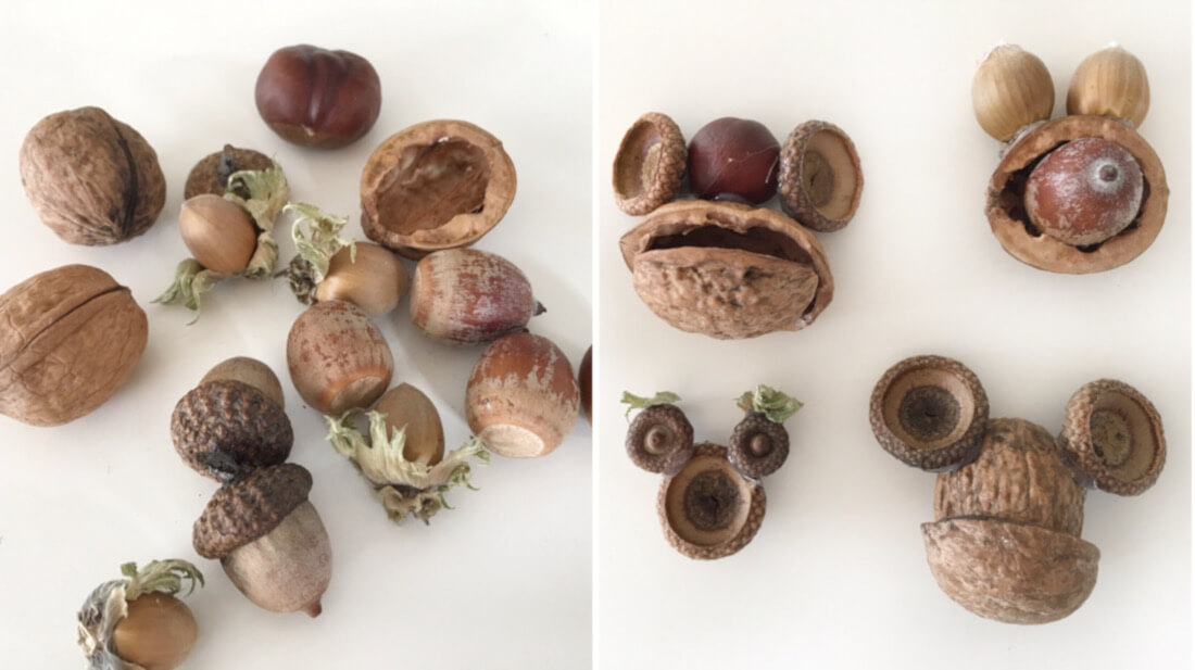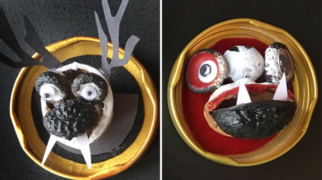 Zum Nachbasteln braucht ihr: Kastanienschalen (wer sagt, denn, dass man nur die Kastanienfrucht zum Basteln verwenden kann?), Eicheln (Früchte und Kappen), Zahnstocher, Wackelaugen (unterschiedliche Größen) und Kleber (am besten Heißkleber).