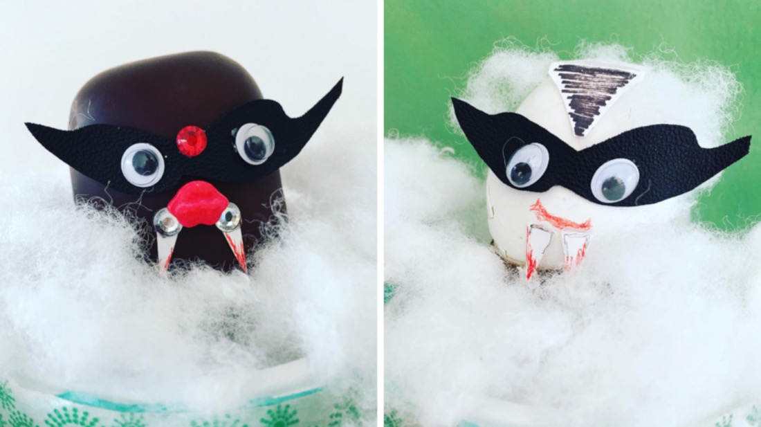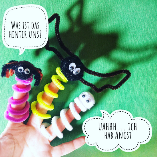 Ganz niedlich sind auch unsere Handpüppchen, die ihr ruckzuck aus ein paar Pfeifenputzern basteln könnt. Und dann kann das lustige Halloween-Rollenspiel losgehen.