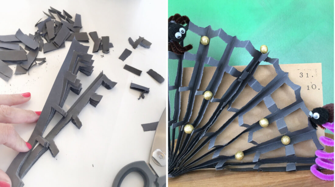 Für die Halloween-Party-Einladung klebt ihr den Spinnenfächer dann auf die Vorderseite eines Briefumschlags. Außerdem könnt ihr die Spinnennetze auch prima als Tisch- oder Raumdeko verwenden.