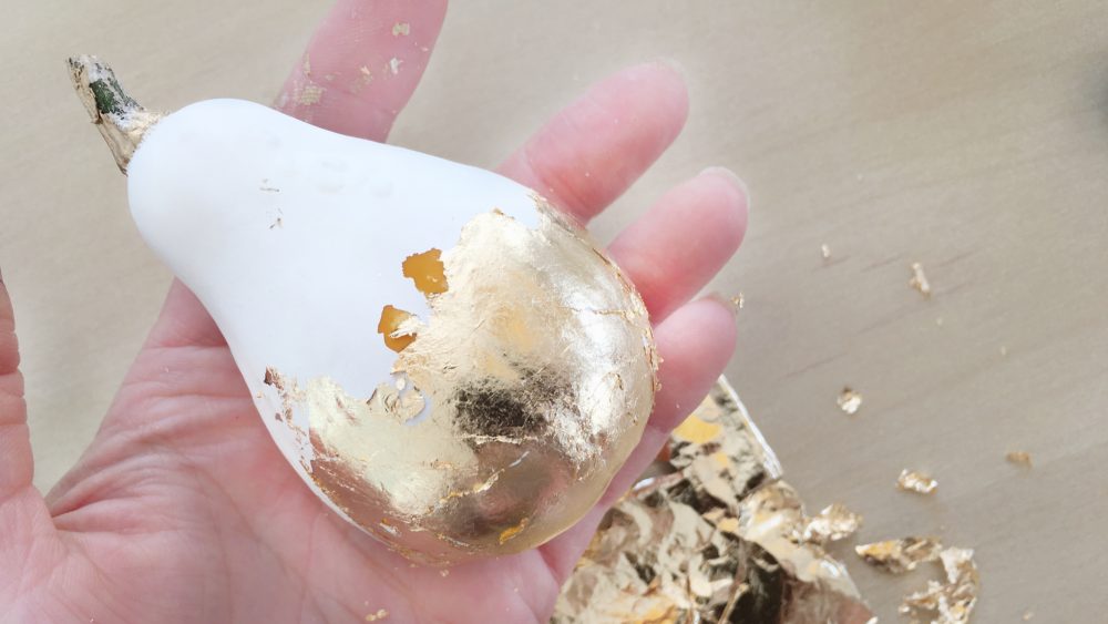 Vielleicht hast du Lust, deinen Kürbis mit Blattgold zu verzieren. Das gibt einen edlen Look und eignet sich besonders gut, für diejenigen, die nicht gerne freihändig mit dem Pinsel malen. Bevor du das Blattgold aufbringst, musst du die Flächen auf deinem Kürbis, auf die das Blattgold aufgetragen werden soll, mit Metallgrund vorbereiten. Auch hier bitte unbedingt die Angaben des Herstellers beachten. Wir waren dabei z.B. etwas zu langsam und haben zu spät mit dem Blattgold weitergearbeitet, was mit ein paar unschönen Stellen bestraft wurde.
