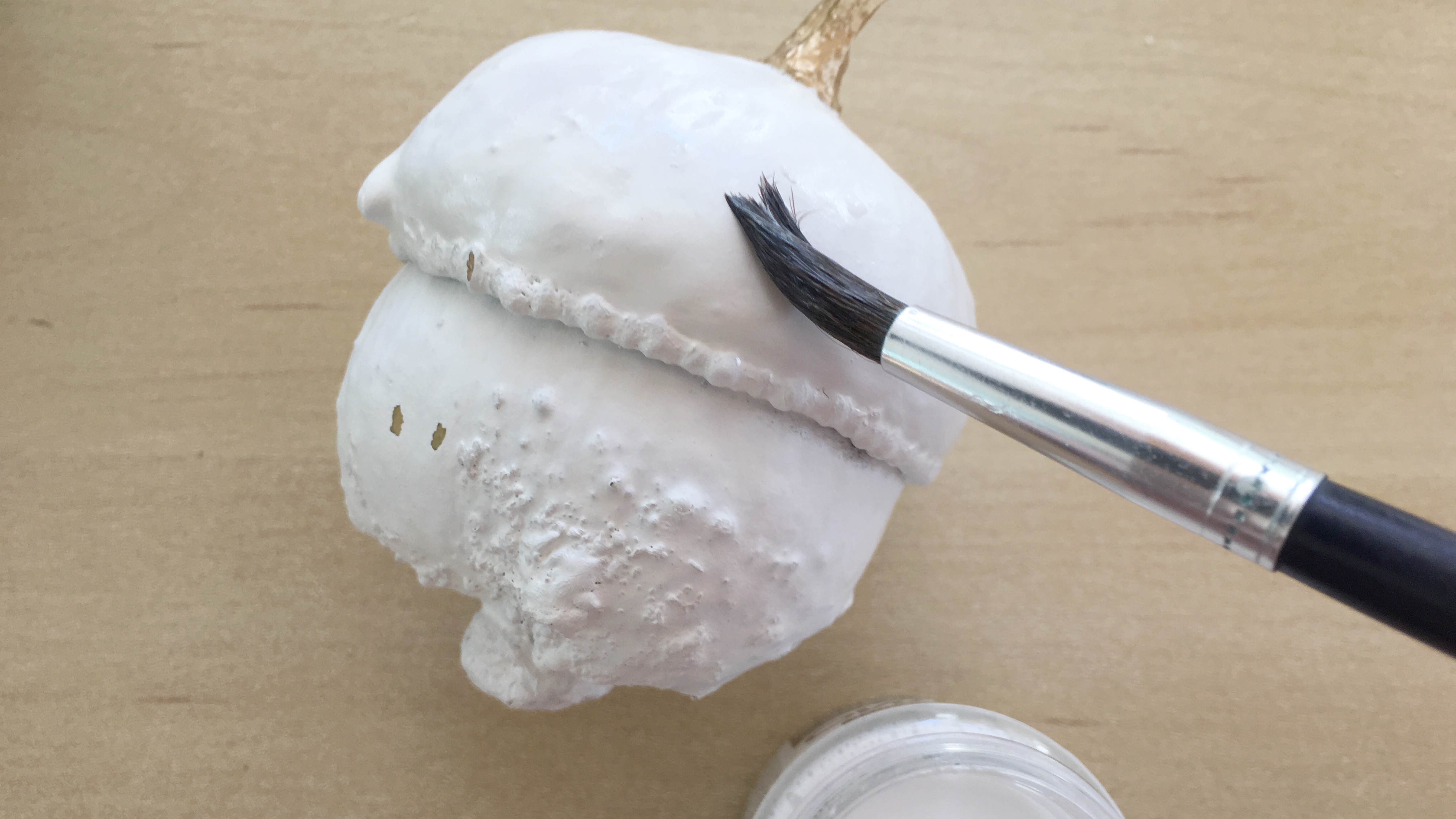 Im ersten Schritt grundierst du alle Kürbisse mit zwei Schichten Acryl-Lackspray in Weiß (oder der Farbe deiner Wahl). Ich kann nur betonen, wie sehr es sich rächt, wenn man die empfohlenen Trocknungszeiten der Hersteller missachtet. Also jede Schicht solange brav trocknen lassen, wie es auf der Dose angegeben wird (Check!).