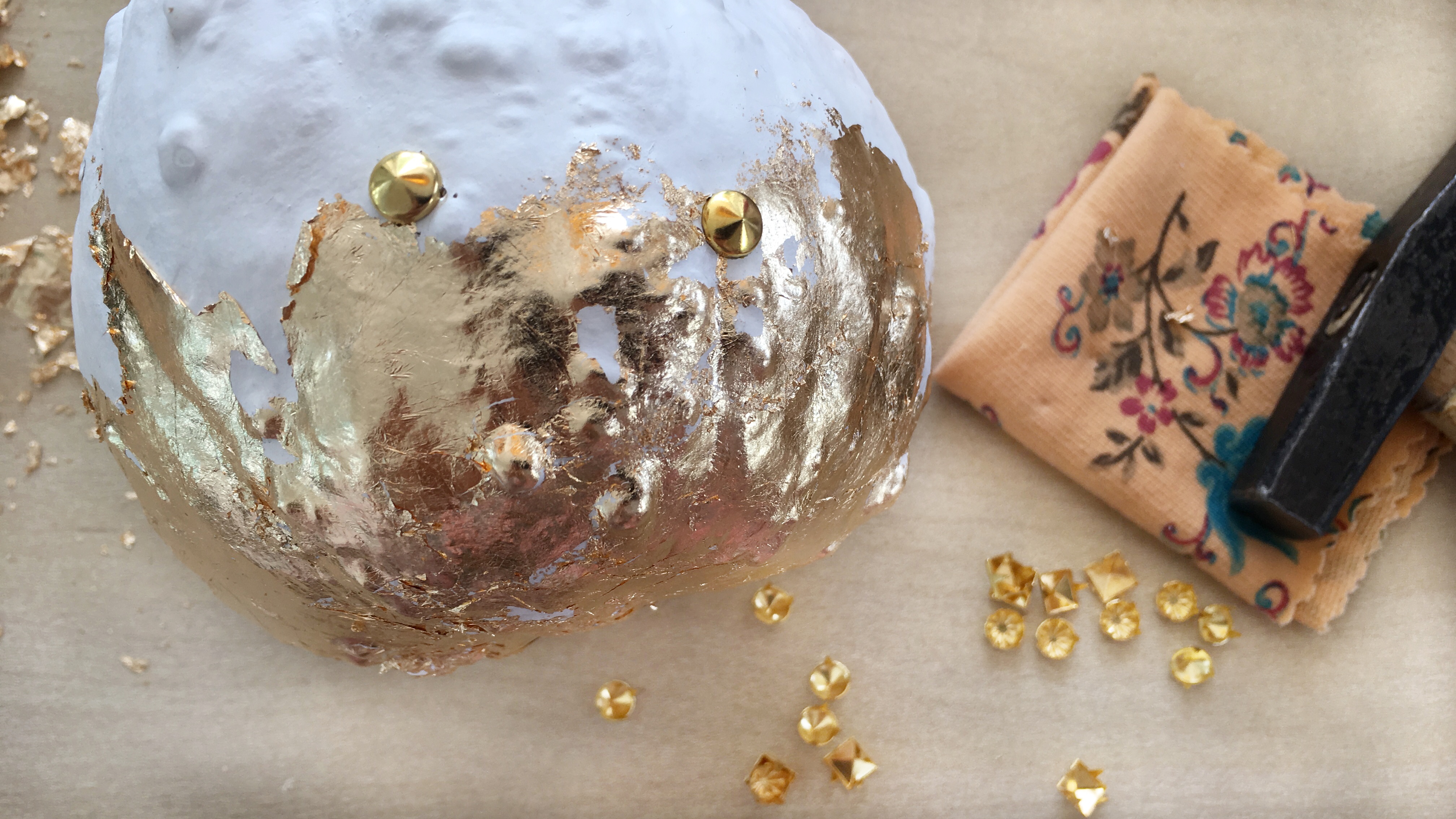 Alternativ oder zusätzlich kannst du deine Kürbisse auch mit kleinen Metallnieten schmücken. Die Metallnieten werden mit dem Hammer in den Kürbis geschlagen. Tipp: Hierbei unbedingt ein kleines Tüchlein zwischen die Nieten und den Hammer legen. So bleiben deine Nieten und der Kürbis unbeschadet und der Hammer kann ordentlich drauf hauen (der Kürbis ist nämlich ganz schön hart).