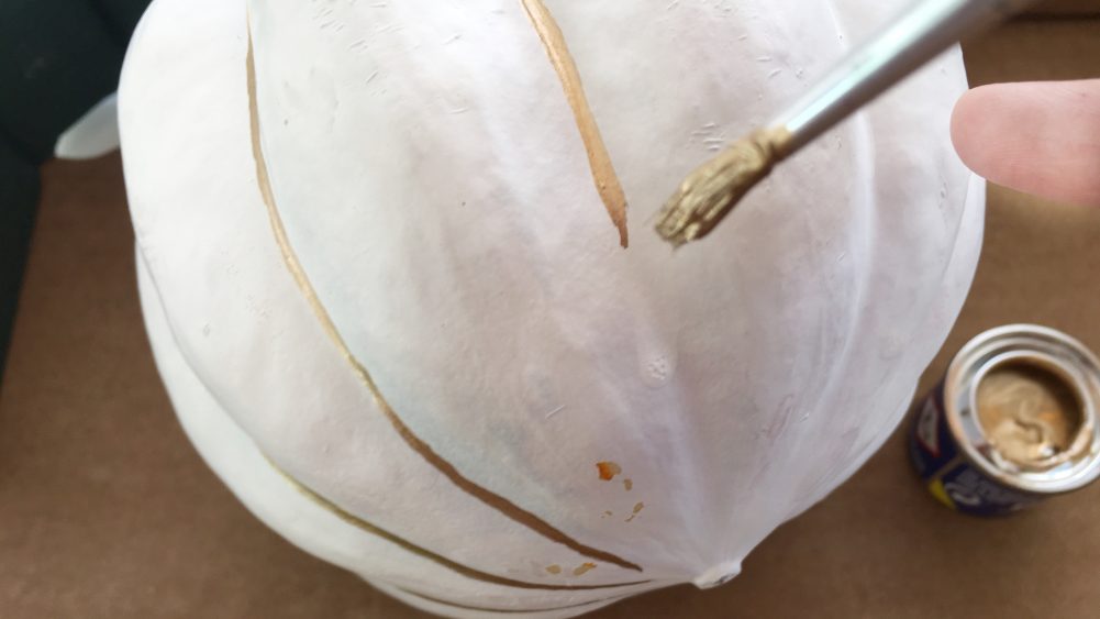 Die Stile der Kürbisse bestreichst du mit einer Schicht Email-Lack in deiner Wunschfarbe (wir lieben Glamour also haben wir uns für Gold entschieden). Den Email-Lack hat Linda kürzlich entdeckt und sie ist von seiner Deckkraft begeistert. Da reicht schon eine Schicht aus. Allerdings riecht er (zumindest in der ölbasierten Variante) recht ungesund… also gut lüften oder mal die wasserbasierte Variante ausprobieren (hab ich erst später gefunden).