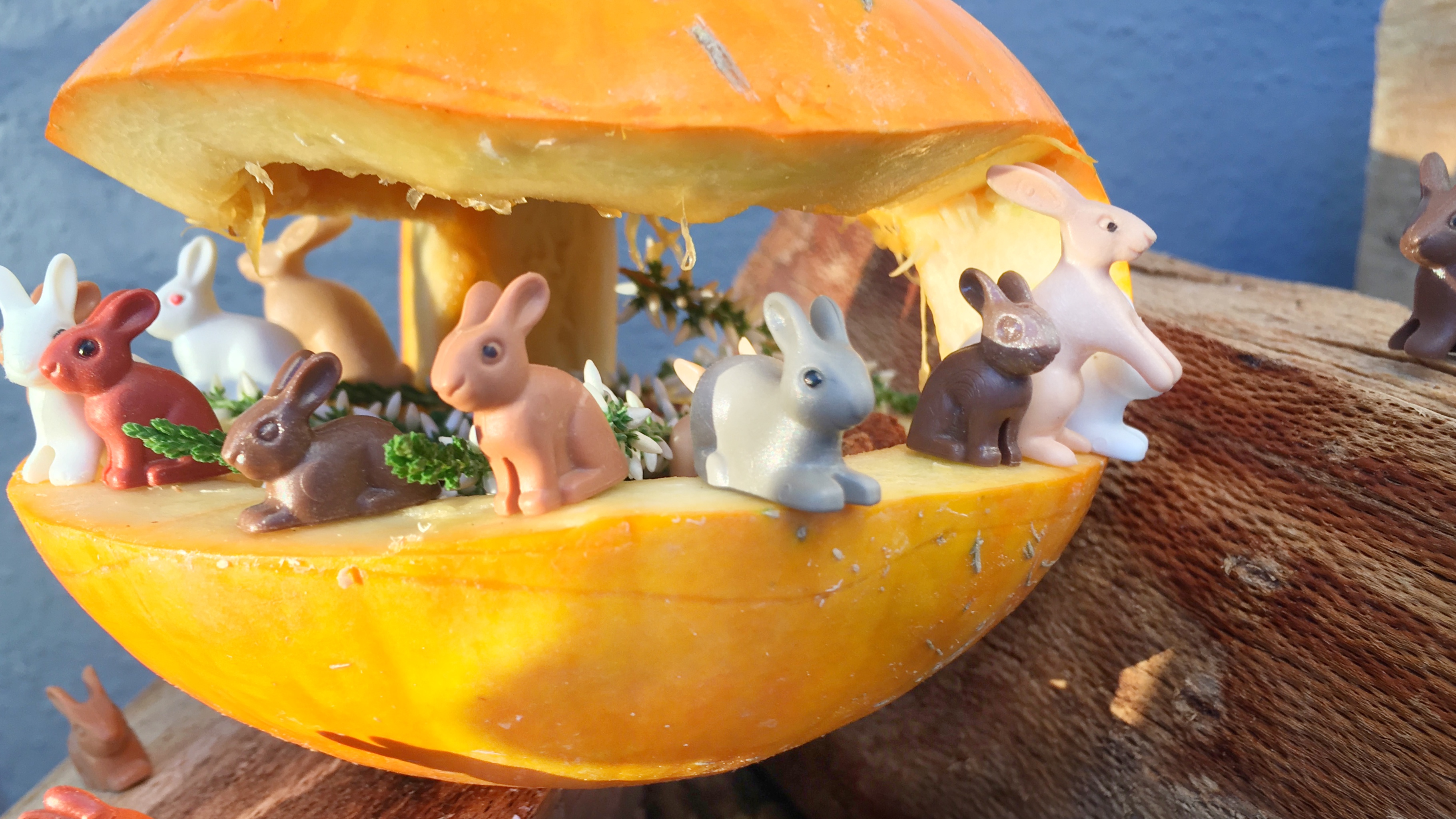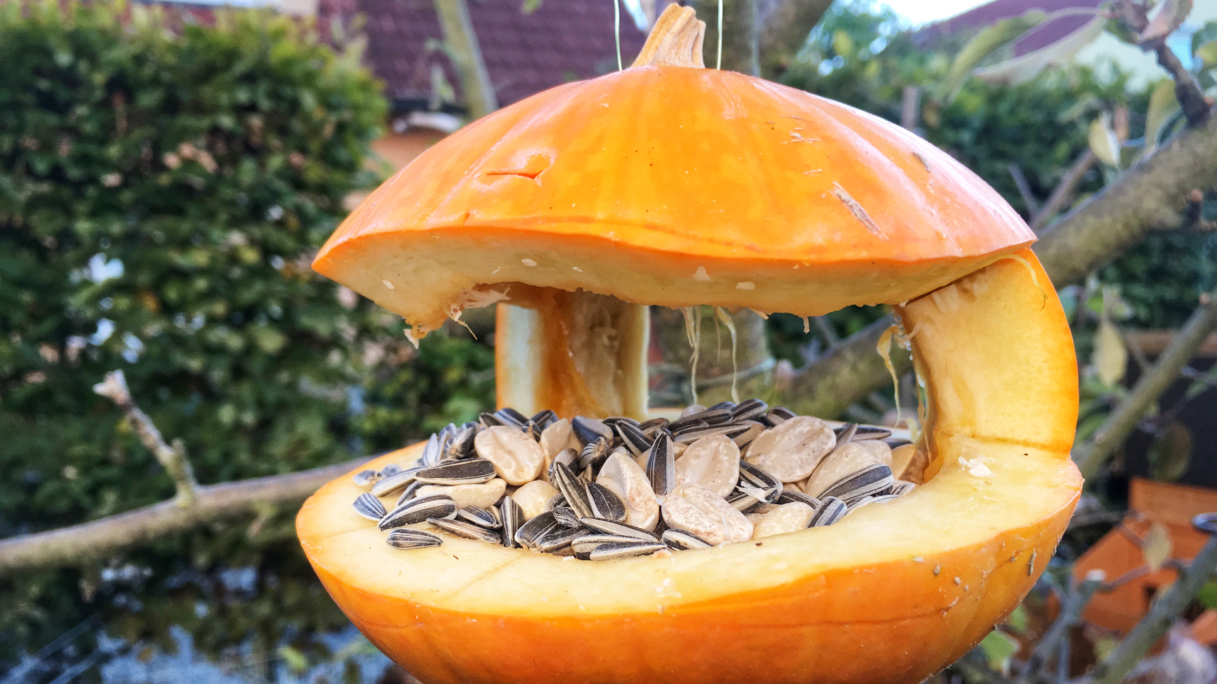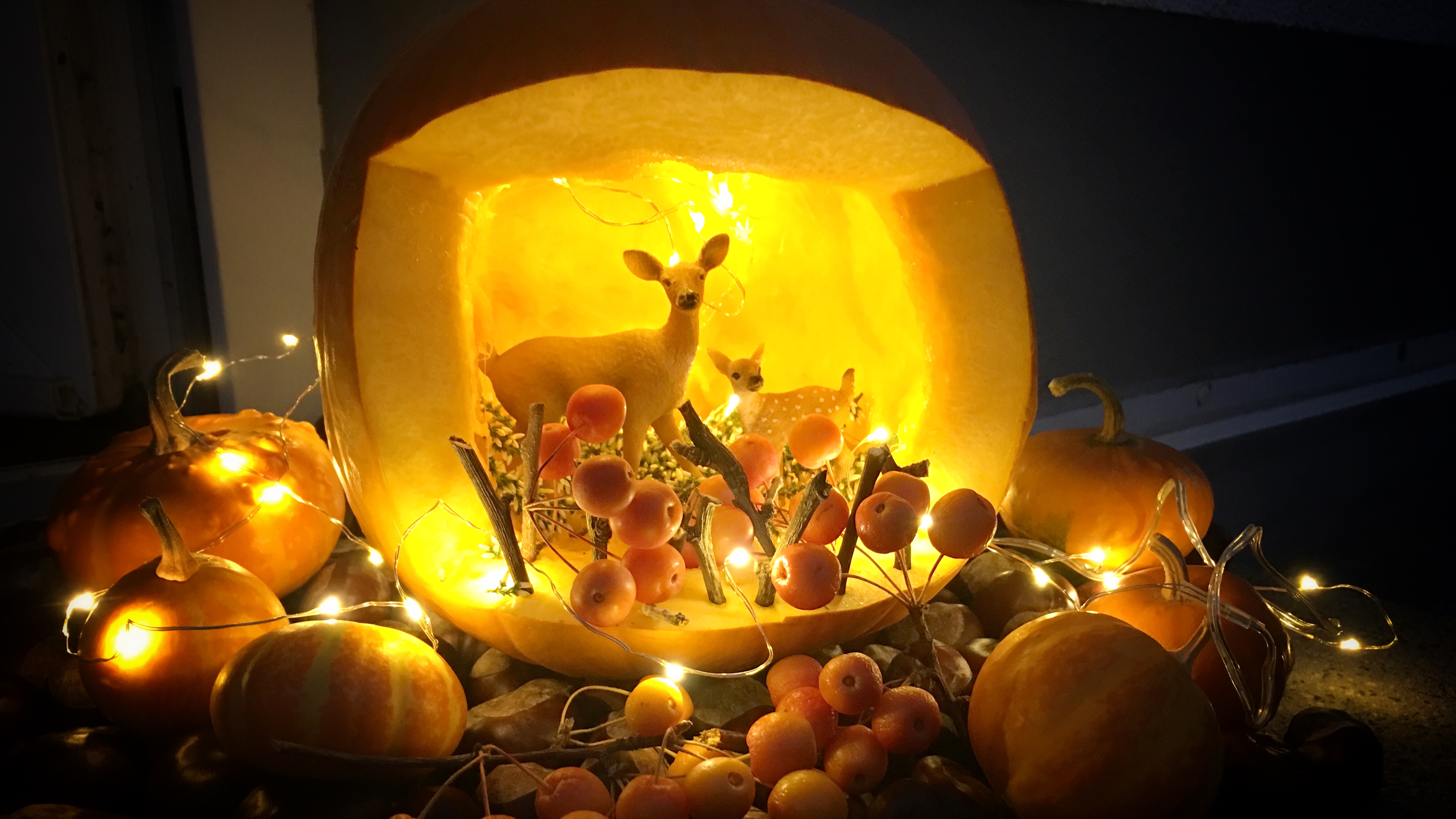 Oder wie wäre es mit einer kuscheligen Höhle für die liebsten Spieltiere? Dekorieren kannst du den ausgehöhlten Kürbis mit Zweigen, Stroh, Blättern etc. Und dann hüpfen die Häschen oder Vögelchen oder was bei dir zuhause am liebsten bespielt wird ins Nest. Macht sich auch sehr hübsch als Garten- oder Terrassendeko.
