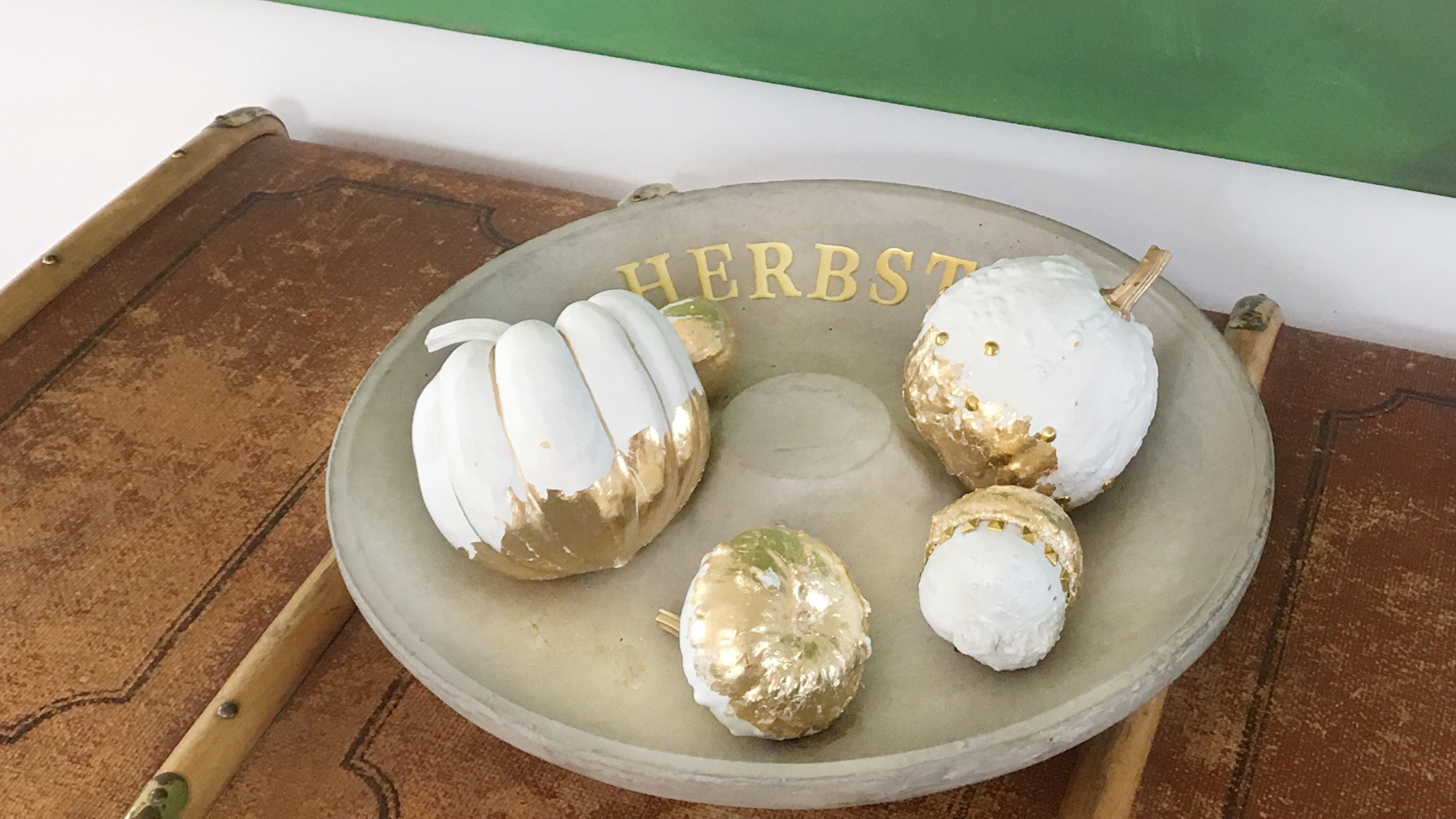 Wir haben uns daheim in hellen Farben eingerichtet, hauptsächlich weiß. Eine typische Kürbisdeko im klassischen Orange hätte da nicht so gut reingepasst. Also haben wir eine Alternative überlegt. Wie findest du unsere weiß-goldene Kürbisdeko? Wie du die einzelnen Varianten ganz einfach nachbasteln kannst, zeigen wir dir jetzt: