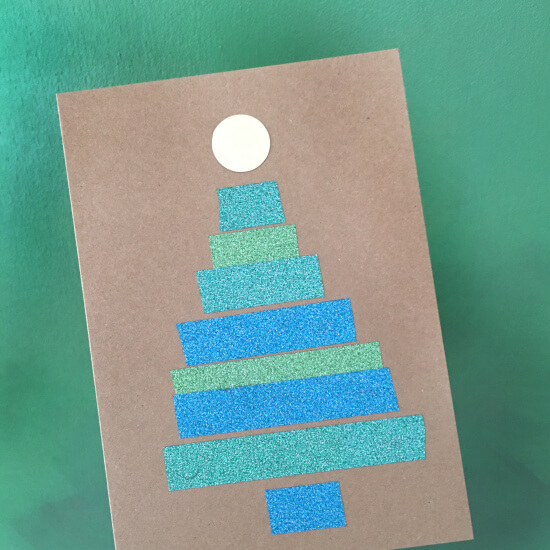 Ihr schneidet das Glitzerklebeband in unterschiedlichen Längen zurecht. So, dass die Streifen immer etwas kürzer werden. Dann klebt ihr die Streifen so auf die Karte, dass sich eine Tannenform ergibt.