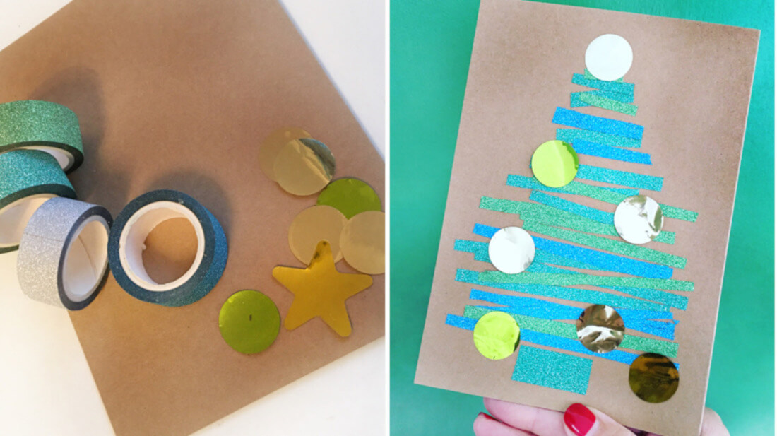 Ihr braucht: Kartenrohlinge aus Craftpapier (oder einfach Craftpapier als Karte zuschneiden), Glitzerklebeband in verschiedenen Blau-Grün-Tönen (oder in euren Lieblingsfarben), Metallic-Konfetti und Bastelkleber.