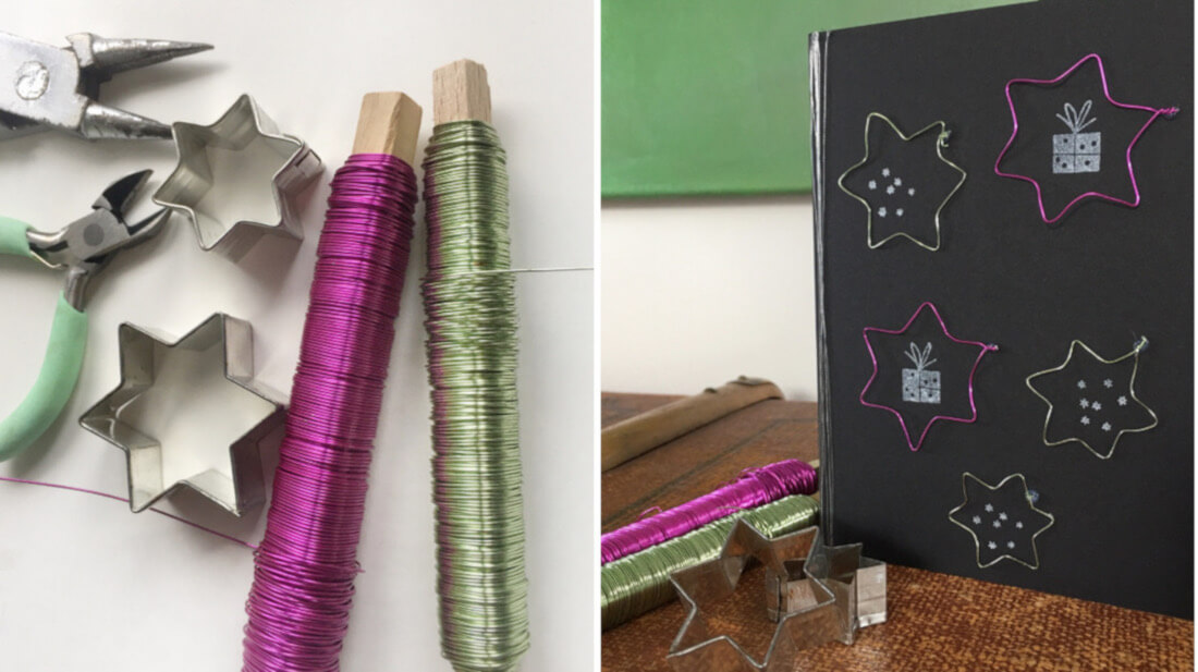 Ihr braucht: Draht in verschiedenen Farben, Ausstecher in Sternform, schwarzen Tonkarton, Stempel, Stempelkissen in gold oder silber, Zangen für den Draht.