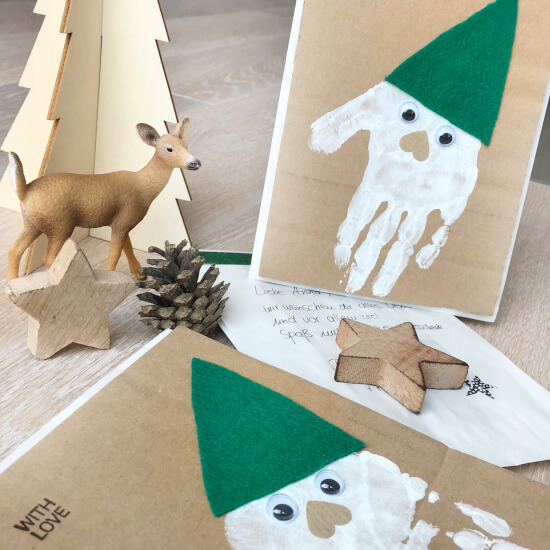 Meine dreijährige Tochter liebt alle Basteleien, bei denen sie einen Handabdruck machen darf. Deshalb ist die Wichtelkarte ihr Favorit.