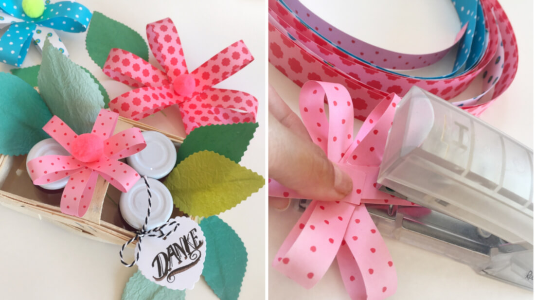 Wie diese Blütenschleifen. Einfach ein paar hübsche Bänder mit Schlaufen zu einer Blüte legen und dann festtackern. Pompom draufkleben. Fertig. Dazu ein paar Blätter (gerne auch echte) oder Zweige gesteckt und schon habt ihr eine hübsche Geschenkverpackung, die kaum Arbeit macht.