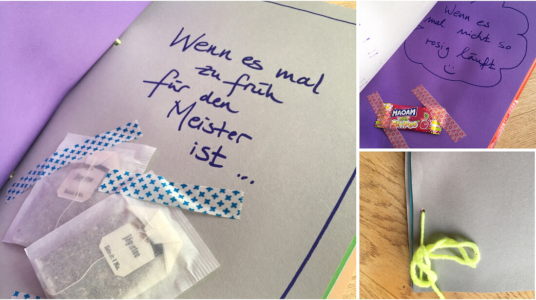 Für das Wenn-Dann-Buch gestaltet jedes Kind eine DINA4-Seite aus Tonkarton. Jede Seite enthält einen Wenn-Satz und ein dazu passendes Geschenk. Ihr könnt eurer Phantasie freien Lauf lassen und eure eigenen Sätze erfinden. Oder ihr schaut einfach im Netz. Es gibt viele Seiten mit lustigen Ideen für diese Wenn-Dann-Seite (hier ein Beispiel).