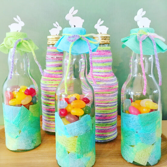 Es gibt sooo viele Möglichkeiten, leere Flaschen zu pimpen. Ihr könnt sie zum Beispiel mit Wollresten bekleben. Oder mit Krepppapier.
