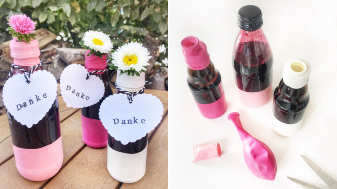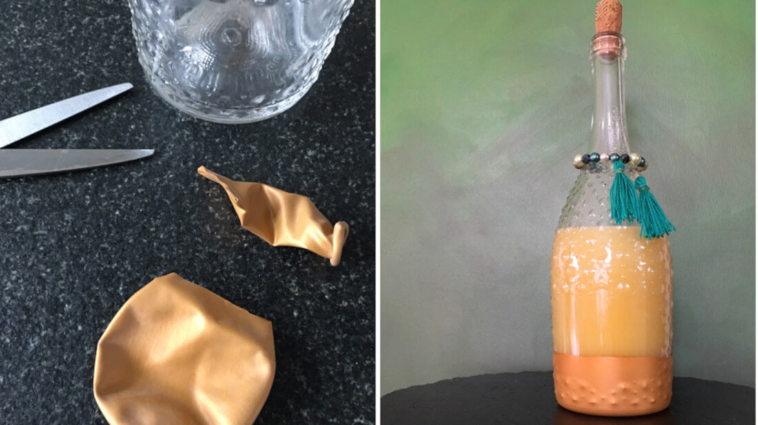 Einfach den “Rüssel” vom Luftballon abschneiden und den unteren Teil über die Flasche ziehen. Fertig! Sieht cool aus und geht ruckzuck!