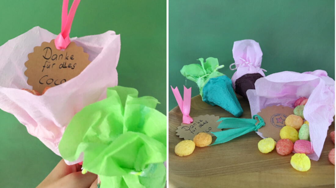 Ihr könnt eure lieben Worte zum Beispiel auf kleine Zettel oder gestanzte Anhänger schreiben. Ans Geschenk angehängt sehen sie hübsch aus. Wenn ihr sie zusammen mit den Süßigkeiten in Mini-Schultüten aus Eierkartons verpackt, gibt es beim Öffnen einen schönen Überraschungseffekt. Wenn jedes Kind eine Minischultüte mit persönlichen Worten bastelt, könnt ihr daraus eine Danke-Girlande machen.
