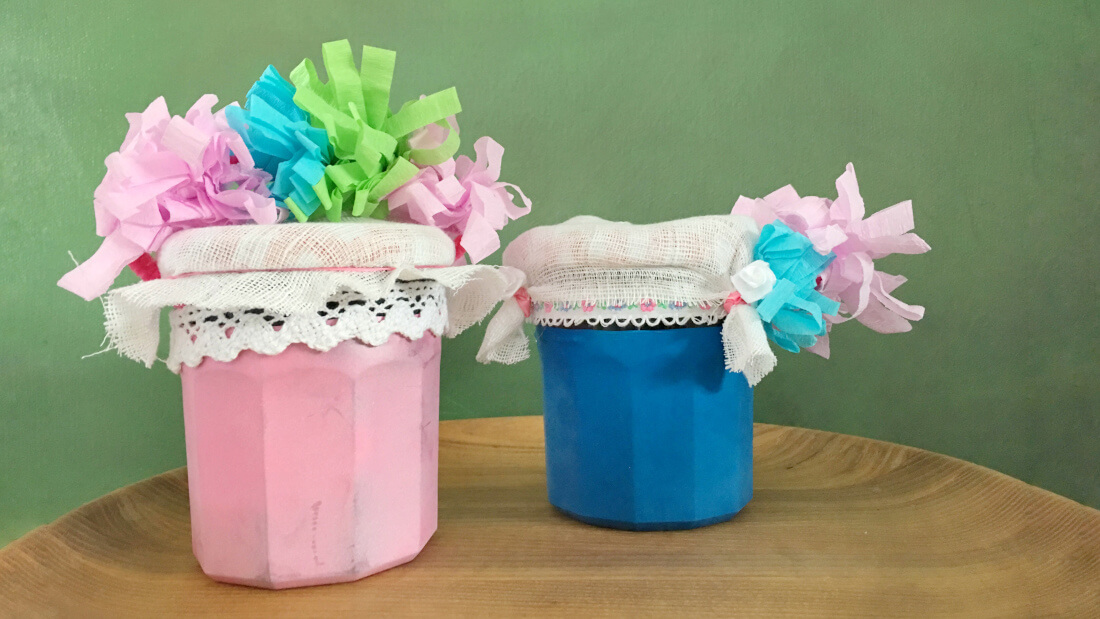Einfach den Zipfel vom Luftballon anschneiden und über das Glas ziehen. Dann aus Stoffresten oder einem Spitzentuch eine hübsche Haube für den Deckel basteln – fertig!