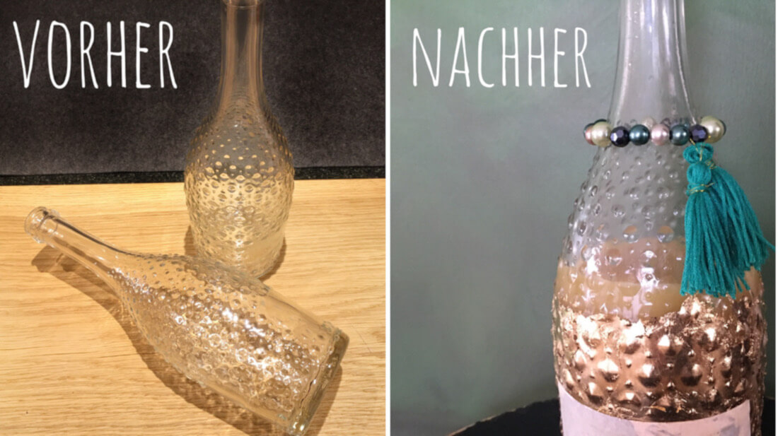 Wir zeigen euch zwei Möglichkeiten. Ihr könnt die Flasche entweder vergolden (das sieht besonders edel aus) oder mit der Luftballontechnik pimpen (das geht ruckzuck). Beide Techniken sind wirklich einfach in der Anwendung.
