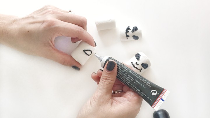 SCHRITT 1: MARS-MALLOWS HERSTELLEN Mit dem schwarzen Lebensmittelfarbestift malst du auf jeden Marshmallow ein Aliengesicht. Trocknen lassen (am besten über Nacht). Fertig ist der Mars-Mallow (= Alien).
