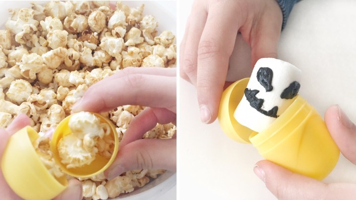 Du brauchst: leere Ü-Eier (je mehr desto besser), Marshmallows, schwarzen Lebensmittelstift, Popcorn und Alufolie. Eine Schüssel oder eine Box.