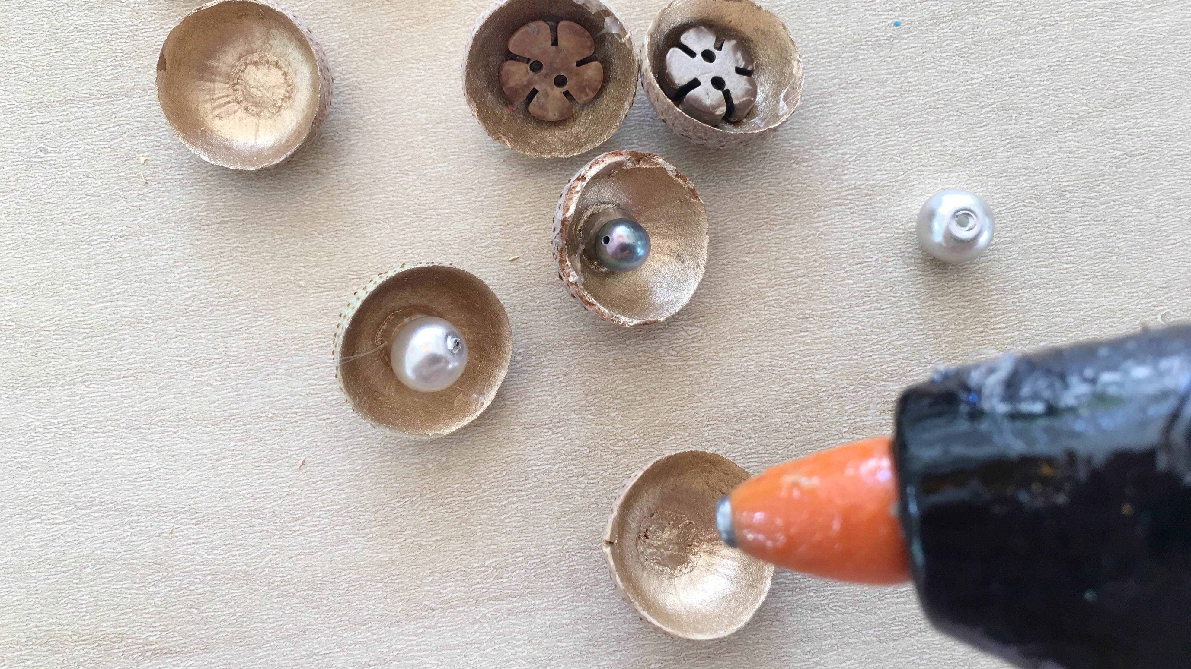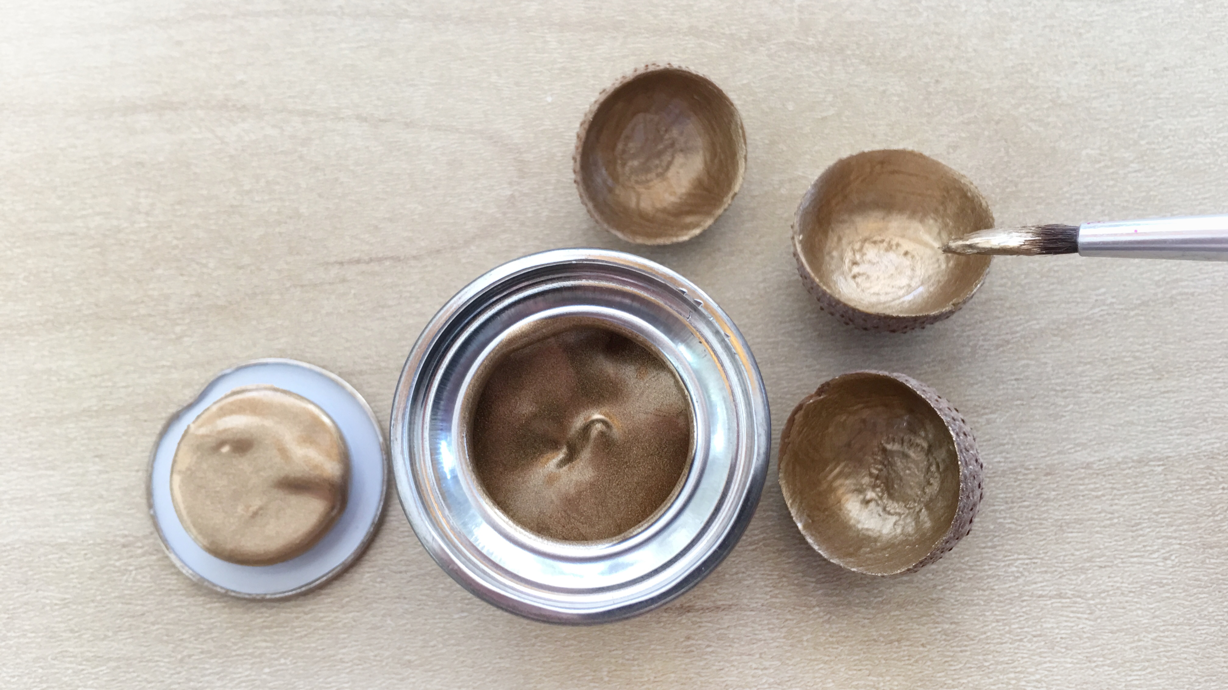 Zunächst einmal lackierst du die Innenseite aller Eichelkappen mit dem Email-Lack in deiner Wunschfarbe (wir haben Gold genommen). Den Lack lässt du solange trocknen, wie es der Hersteller empfiehlt. (Wir haben festgestellt, dass es durchaus Sinn macht, sich nicht über die offiziellen Empfehlungen hinwegzusetzen… mhh ja wir sind manchmal etwas ungeduldig. Bringt aber hier nix). Die gute Nachricht ist: Der Lack deckt hervorragend, so dass eine Schicht ausreichend ist.