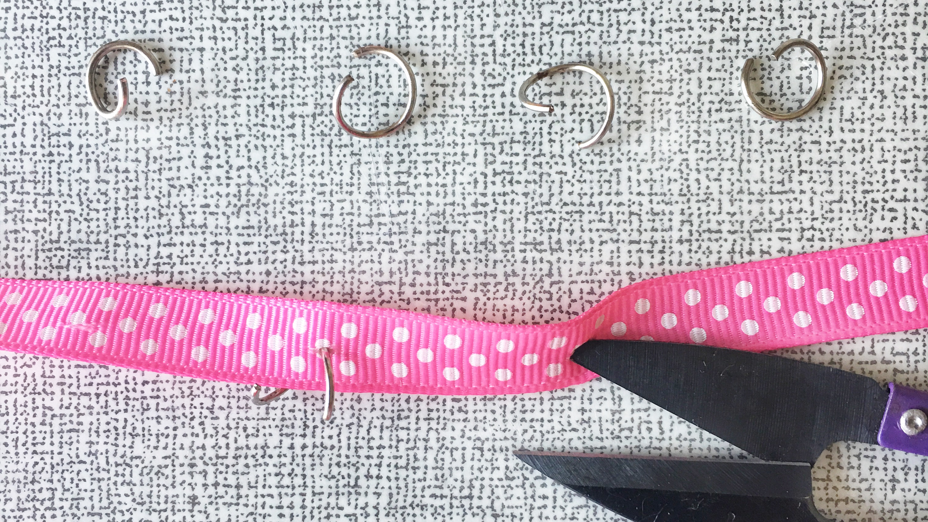 Du kannst deine Anhänger an ein Lederbändchen hängen oder, wie wir, mit einem Schleifenband arbeiten. Dazu machst du mit einer spitzen Schere in einem Abstand von ca. 2,5 cm 2-3 kleine Löcher in das Schleifenband (wenn du eine feine Lochzange hast, ist die natürlich noch besser). Tipp: Ich empfehle dir, die Größe der Metallöse auf die Größe des Anhängers abzustimmen. Ich hatte zuerst alle Ösen gleich gross gewählt, was mir am Schluss nicht so gut gefallen hat.