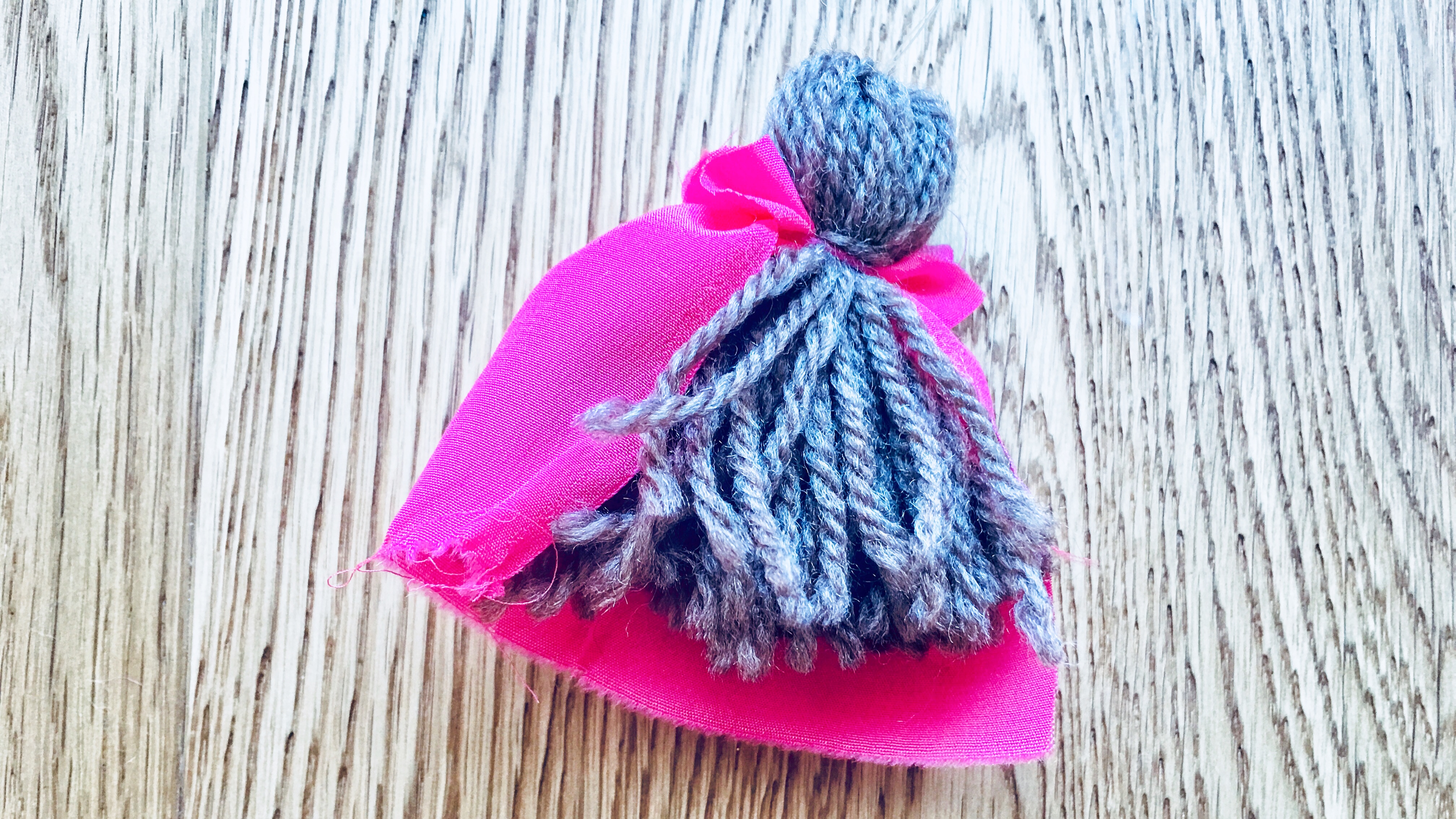 Als echter Superheld mit der magischen Fähigkeit, miese Stimmung zu verjagen, braucht unser Motivationsgespenst natürlich einen Umhang. Dazu legst du den kleinen Stoffstreifen um die Wollquaste und bindest ihn mit einem Baumwollgarn so fest, dass ein kleiner Rand als Kragen stehen bleibt. Raff den Stoff oben am Kragen etwas zusammen und verteile die Falten gleichmäßig.  Zusätzlich kannst du mit einem hübschen Garn (z.B. Bäckergarn) vorne eine Schleife binden (siehe Titelbild). Jetzt den Umhang noch kürzen, indem du ihn unten bis auf die gewünschte Länge abschneidest. Falls der Stoff ausfranst, kannst du die Stoffkante mit etwas Klebstoff fixieren (Ruckzuck-Variante) oder umnähen (etwas aufwändiger).
