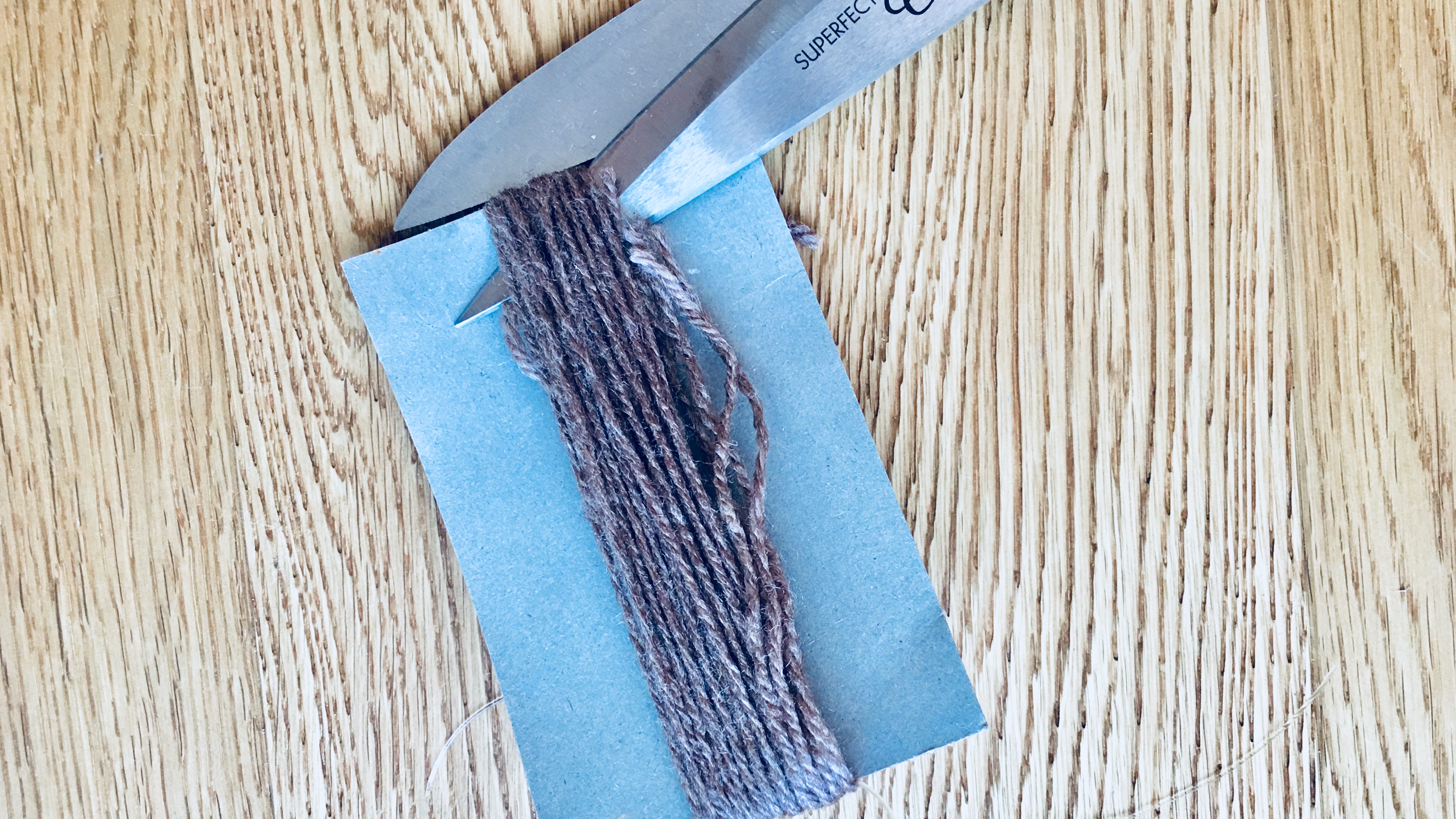 Als erstes wickelst du die Wolle immer wieder um ein rechteckiges Stück Pappe (ca. 25-30 Mal oder solange bis dir die Dicke gefällt). Bevor du deine Wollschlaufe an einem Ende aufschneidest, vergiss nicht am anderen Ende einen Nylonfaden durchzufädeln und mit einem Knoten so zu fixieren, dass zwei gleichlange Nylonenden runterhängen, die du dann verknotest. Diese brauchen wir später noch für die hübschen Perlen.
