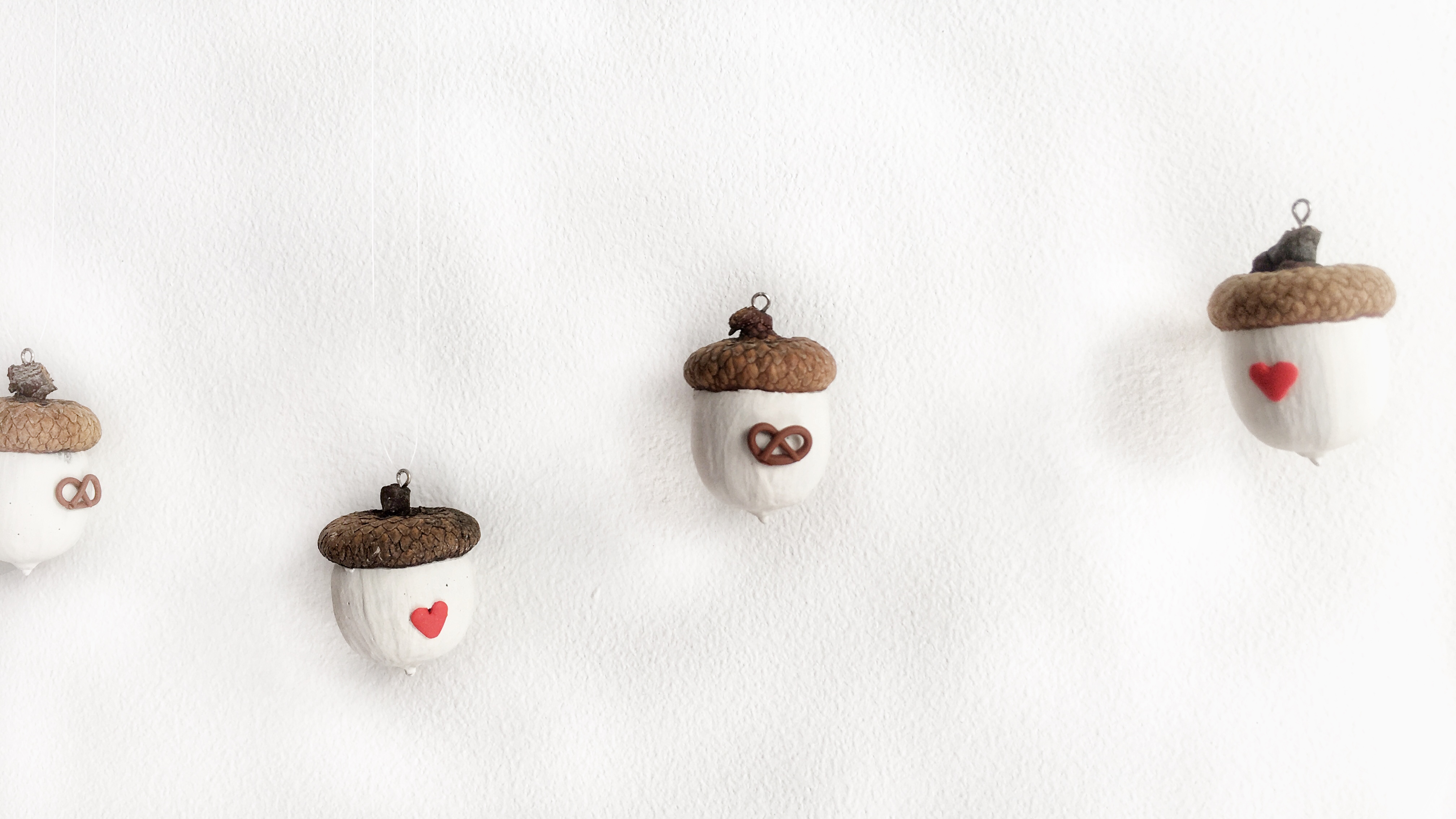 Dazu steckst du in jede Eichelkappe eine Metallöse und klebst sie mit Sekundenkleber an der Kappe fest. Die Kappe wird ebenfalls mit Sekundenkleber an der Eichelfrucht befestigt. Zum Schluss klebst du noch deine Fimo Applikationen auf die weiße Eichelfrucht und befestigst eine Nylonschlaufe an der Metallöse.