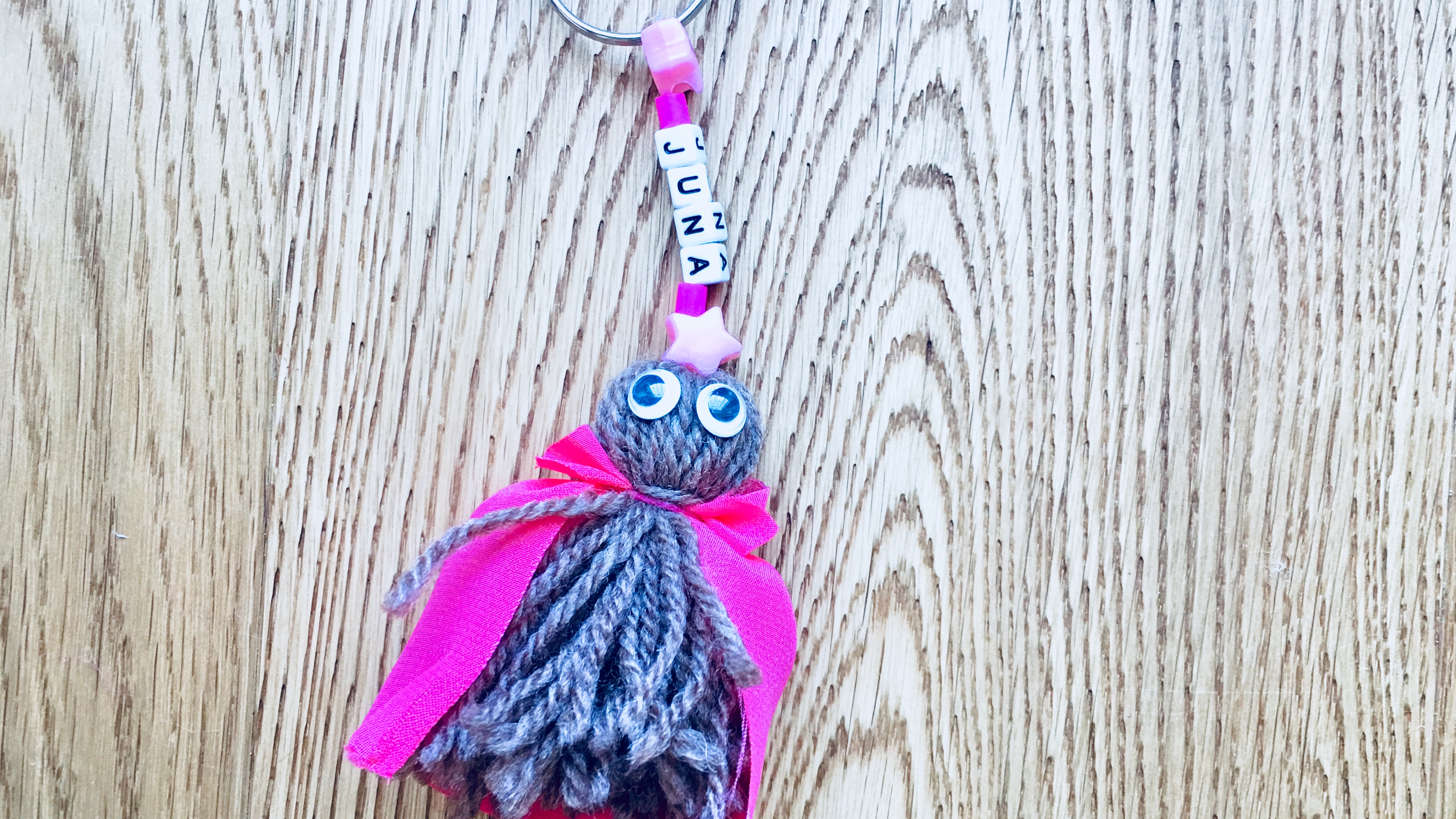 Zum Schluss fädelst du auf den Nylonfaden am Kopf unseres Motivationsgespenstes die hübschen Perlen auf und bindest am Ende einen Schlüsselring dran. Tipp: Am besten machst du mehrere Knoten und ziehst die richtig fest damit alles gut hält. Jetzt ist der Superheld fertig, oder? Ach nein, er kann ja noch garnichts sehen. Jetzt noch schnell die Augen ankleben und dann kann es losgehen, mit dem Gute-Laune machen.
