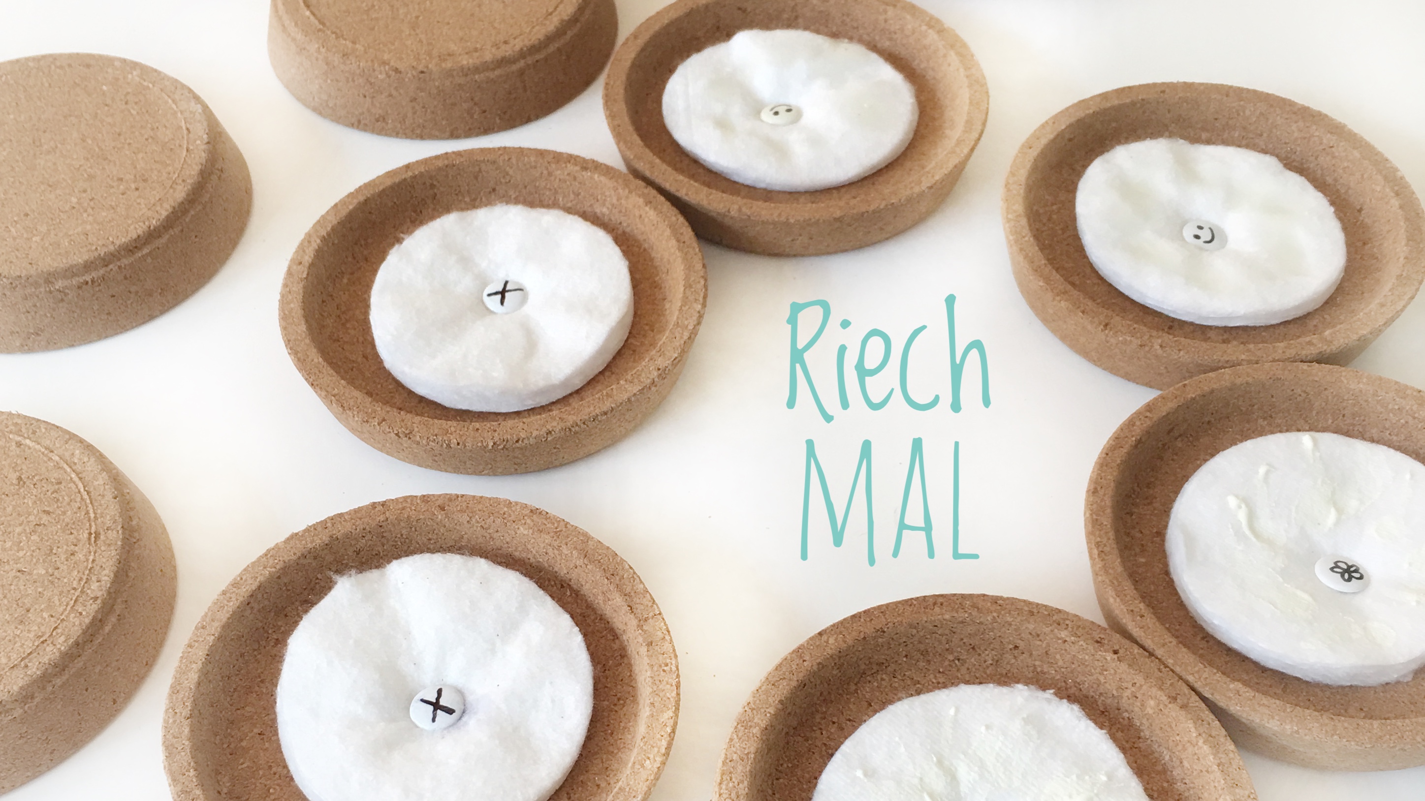 Für ein Riech-Memory brauchst du eine gerade Anzahl an Wattepads und einige Flüssigkeiten oder Pasten, die sich im Geruch voneinander mehr oder weniger unterscheiden (je nach gewünschtem Schwierigkeitsgrad nimmst du eher ähnliche oder eher unterschiedliche Gerüche). Wir haben die Wattepads mit Hilfe von weißen Reißnägeln an Korkuntersetzern befestigt und jeweils 2 Wattepads mit dem gleichen Duftmaterial bestrichen. Basteltipp: Du solltest die jeweiligen Duftpaare unbedingt kennzeichnen damit du später kontrollieren kannst, was zusammengehört. Wir haben die Reißnägel mit einem schwarzem Edding mit Symbolen markiert. Spieltipp: Am besten machen die Mitspieler beim Riechen die Augen zu – so können sie sich am besten auf ihren Geruchssinn konzentrieren. Ein Spieler beginnt und sucht zwei Untersetzer aus (ohne auf die Markierungen zu schauen). Dann versucht er am Geruch zu erkennen, ob es sich um ein Geruchspaar handelt oder nicht. Liegt er richtig, darf er es behalten und noch einmal sein Glück versuchen. Liegt er daneben, ist der nächste Mitspieler an der Reihe. Variante: Du kannst Sonderpunkte vergeben, wenn ein Spieler nicht nur das Geruchspaar findet, sondern auch erraten kann, um was es sich dabei handelt.