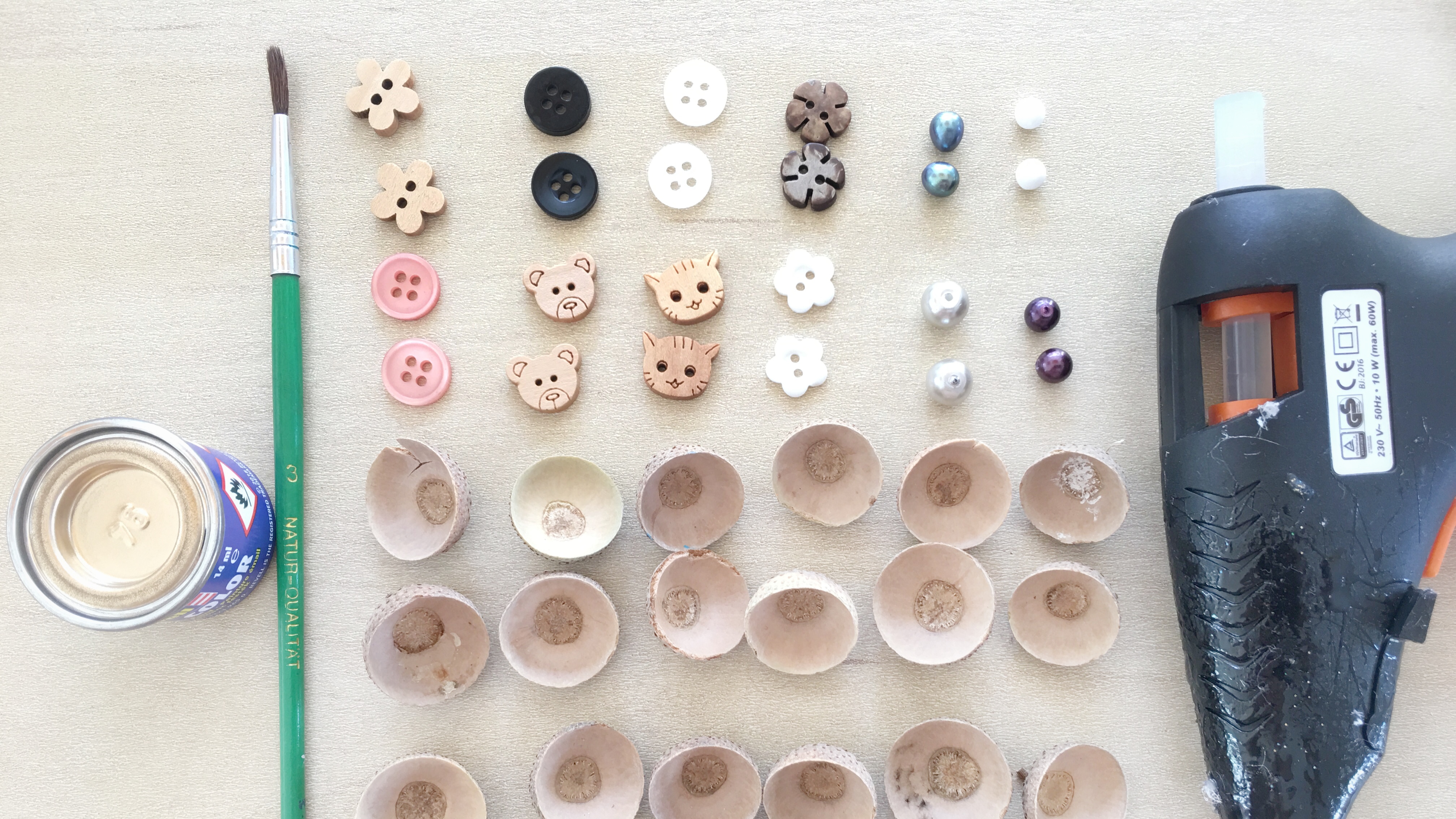 • Kleine Memory-Paare (z.B. Knöpfe, Perlen, Kaffeebohnen, Bügelperlen)… du kannst alles nehmen, was in die Eichelkappen passt