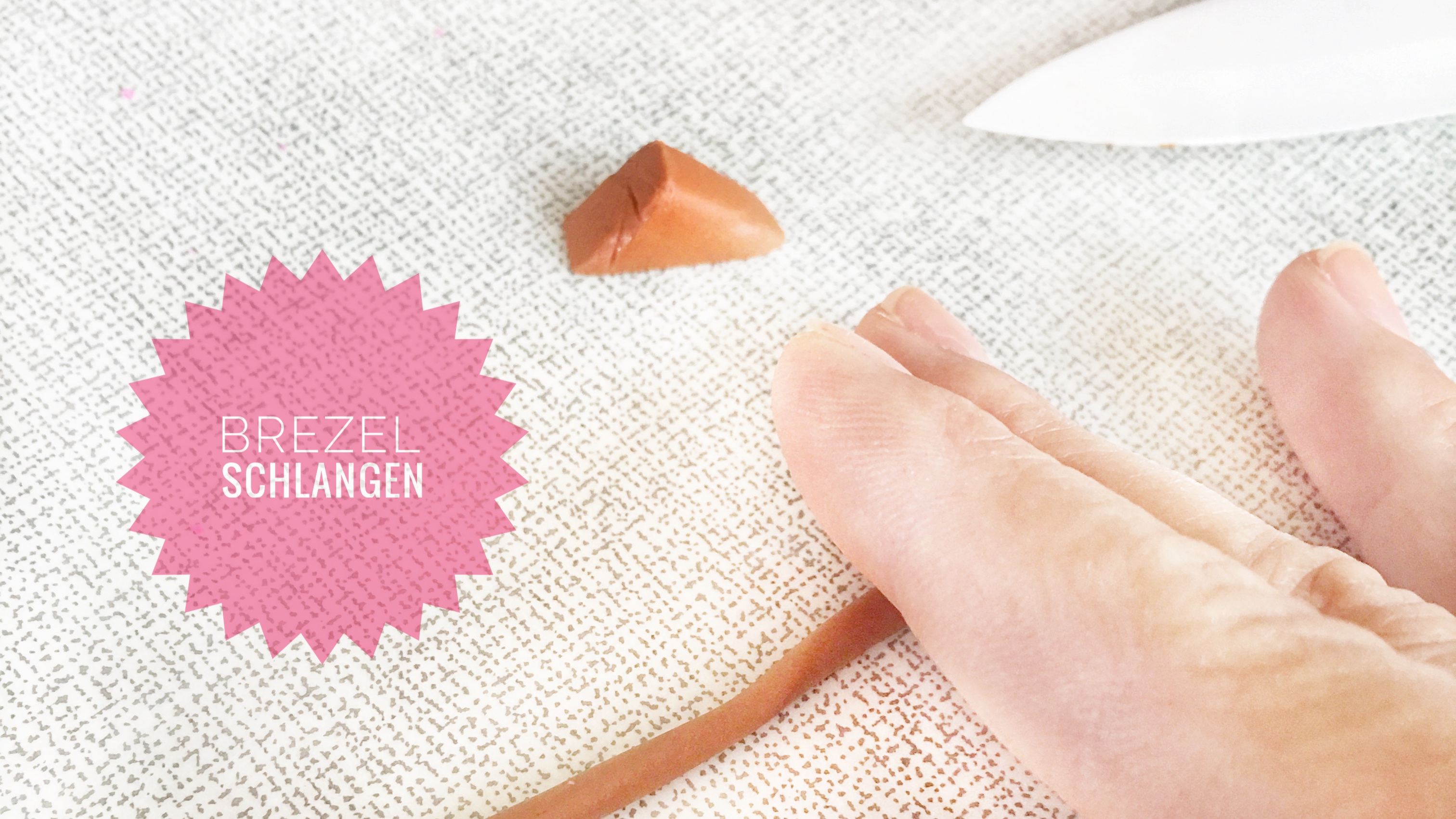 Die Brezn (oder Hochdeutsch: Brezel) gehört, neben einer guten Maß Bier, zu jeder Wiesn dazu. Warum also nicht gleich eine Mini-Variante als Schmuck? Ein Brezn-Charm hat richtig Charme … (Achtung wahnsinniger Anfänger-Reim). So jetzt geht’s aber an die Arbeit: Als Vorbereitung für deine Brezel-Anhänger rollst du lange Fimo-Würste und formst sie jeweils zu einer Brezel. Nach 1-2 Mal hast du den Dreh raus.