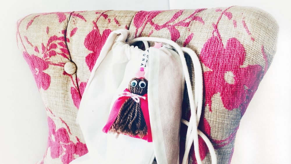 Als echter Superheld mit der magischen Fähigkeit, miese Stimmung zu verjagen, braucht unser Motivationsgespenst natürlich einen Umhang. Dazu legst du den kleinen Stoffstreifen um die Wollquaste und bindest ihn mit einem Baumwollgarn so fest, dass ein kleiner Rand als Kragen stehen bleibt. Raff den Stoff oben am Kragen etwas zusammen und verteile die Falten gleichmäßig.  Zusätzlich kannst du mit einem hübschen Garn (z.B. Bäckergarn) vorne eine Schleife binden (siehe Titelbild). Jetzt den Umhang noch kürzen, indem du ihn unten bis auf die gewünschte Länge abschneidest. Falls der Stoff ausfranst, kannst du die Stoffkante mit etwas Klebstoff fixieren (Ruckzuck-Variante) oder umnähen (etwas aufwändiger).
