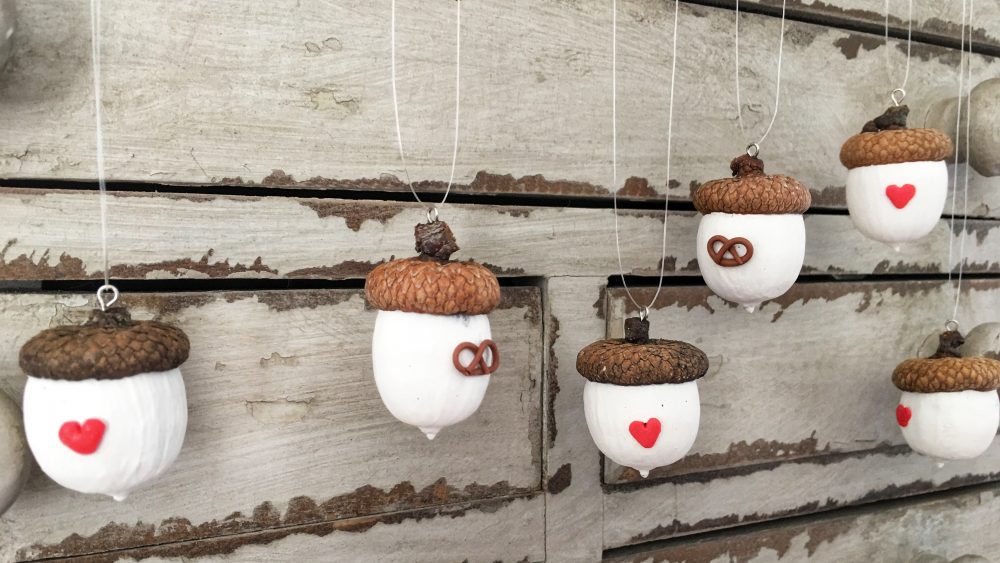 Dazu steckst du in jede Eichelkappe eine Metallöse und klebst sie mit Sekundenkleber an der Kappe fest. Die Kappe wird ebenfalls mit Sekundenkleber an der Eichelfrucht befestigt. Zum Schluss klebst du noch deine Fimo Applikationen auf die weiße Eichelfrucht und befestigst eine Nylonschlaufe an der Metallöse.