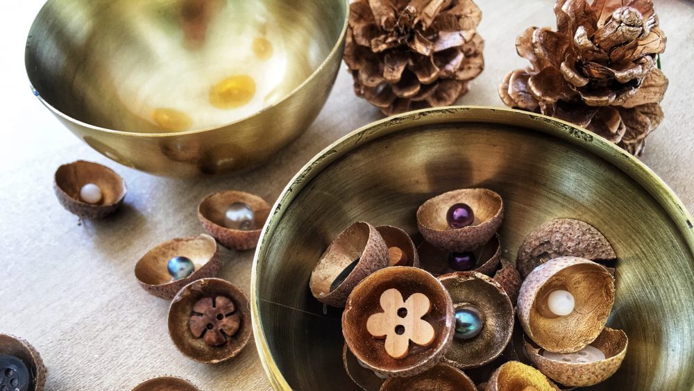 • Kleine Memory-Paare (z.B. Knöpfe, Perlen, Kaffeebohnen, Bügelperlen)… du kannst alles nehmen, was in die Eichelkappen passt